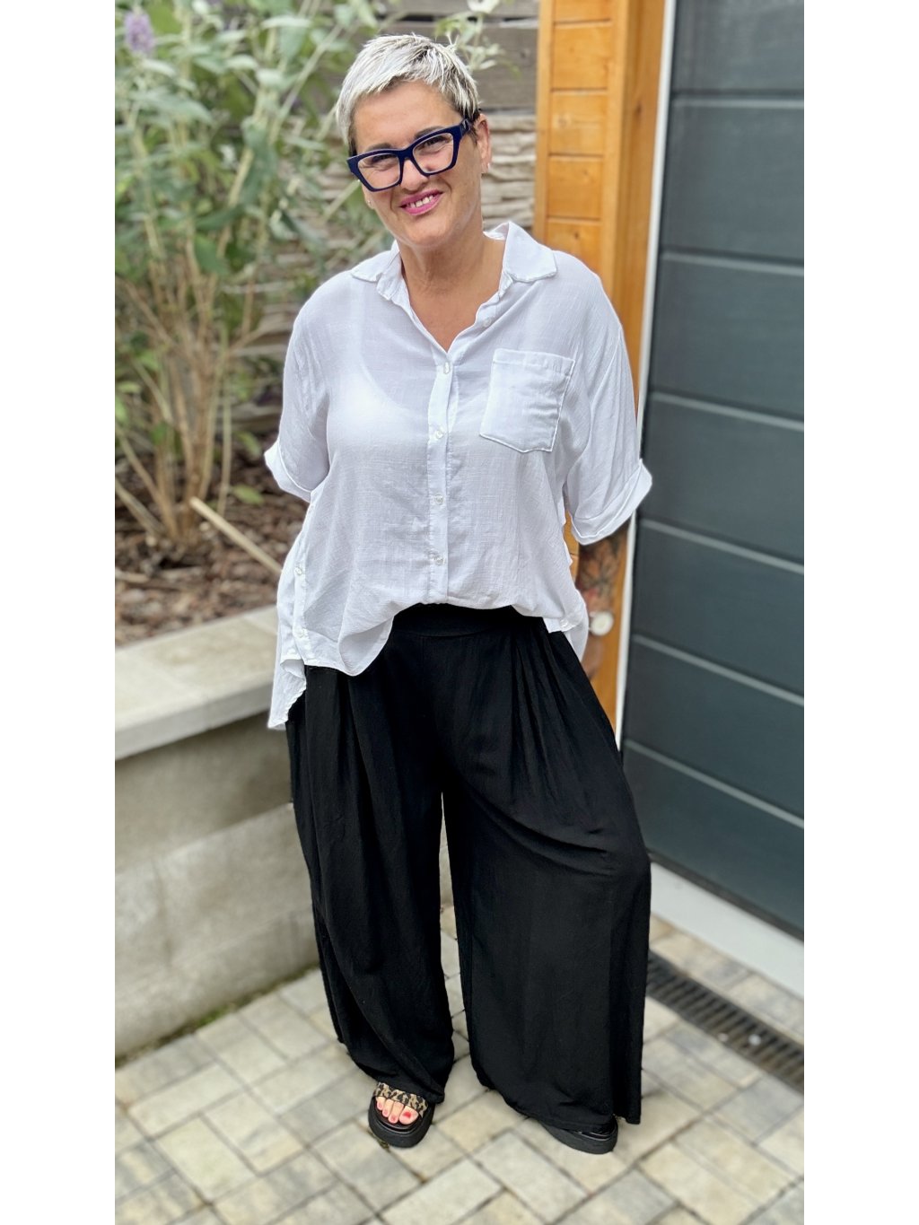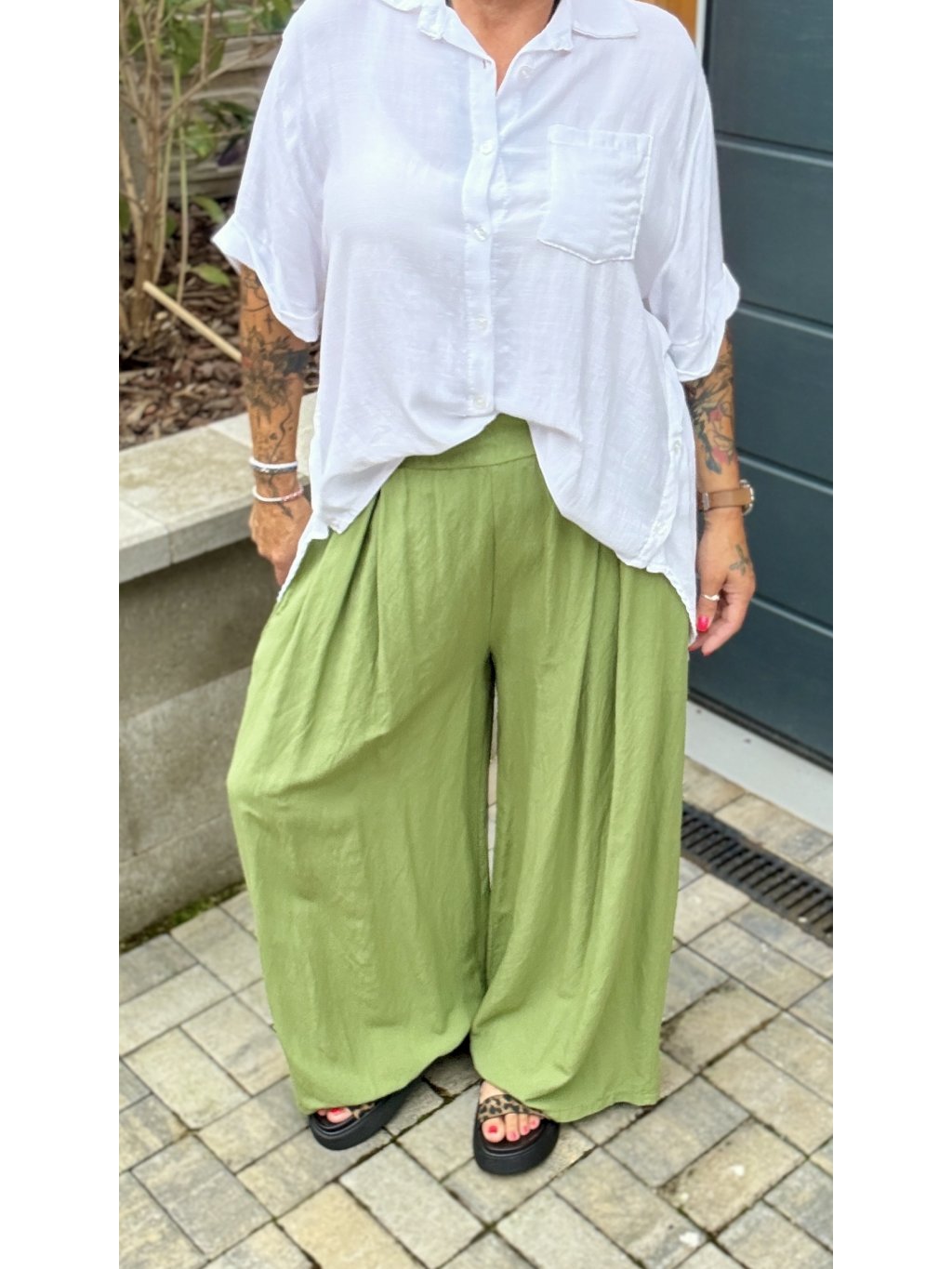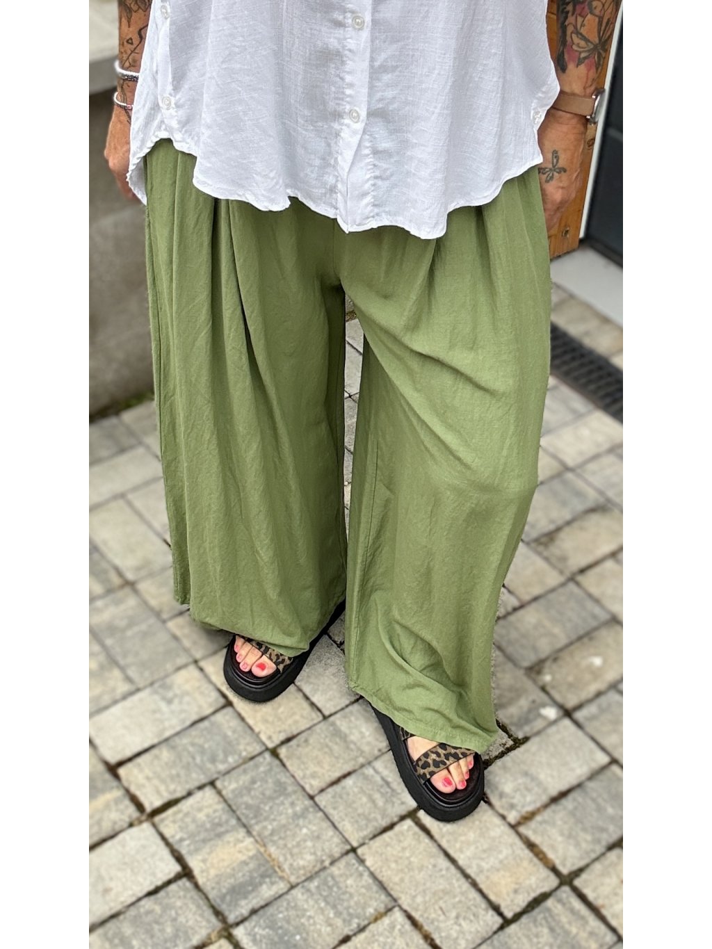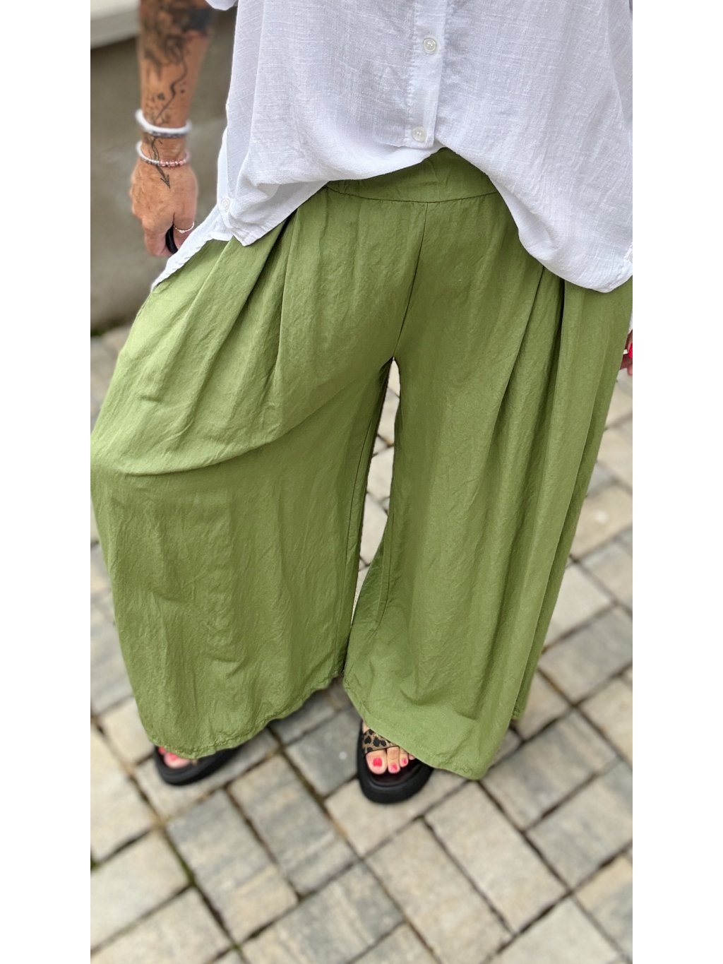 Tyhle volné kalhoty jsou must-have kouskem letní sezóny! Jsou lehoučké, neskutečně příjemné na těle a díky pružnému pasu skvěle sedí. Volný střih poskytuje absolutní volnost pohybu a díky jemnému skladu v pase krásně kopírují siluetu bez obepnutí. Ideální na výlety, práci i městský šrumec. Černá varianta je elegantní stálice, zelená dodá outfitu svěží šmrnc.