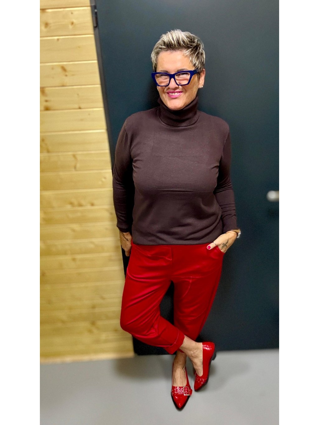 Materiál je pružný a adaptabilní, takže se dokonale přizpůsobí různým typům postav. Díky klasickému střihu je ideální jako samostatný kousek nebo vrstva pod vestu, sako či kabát.