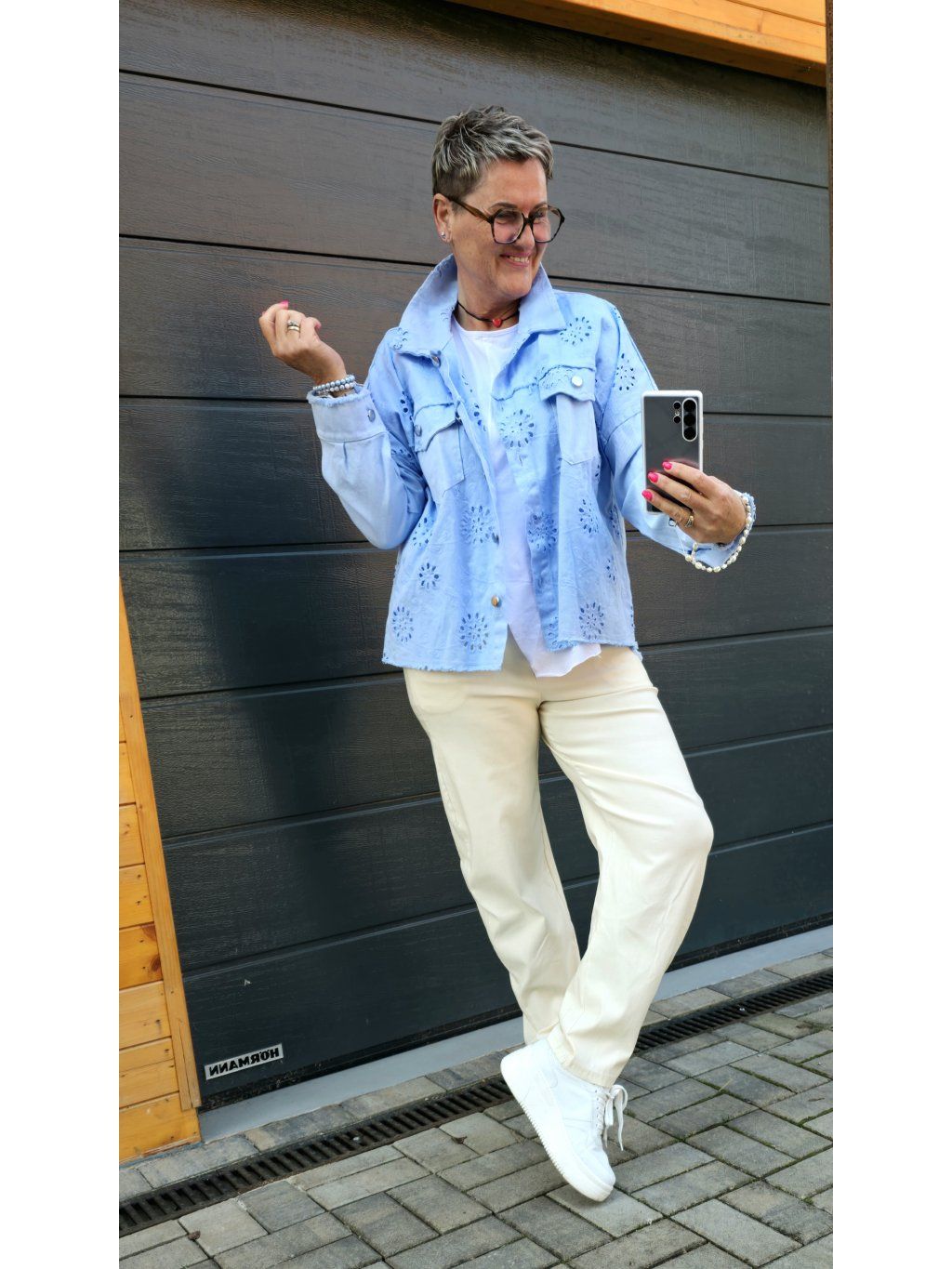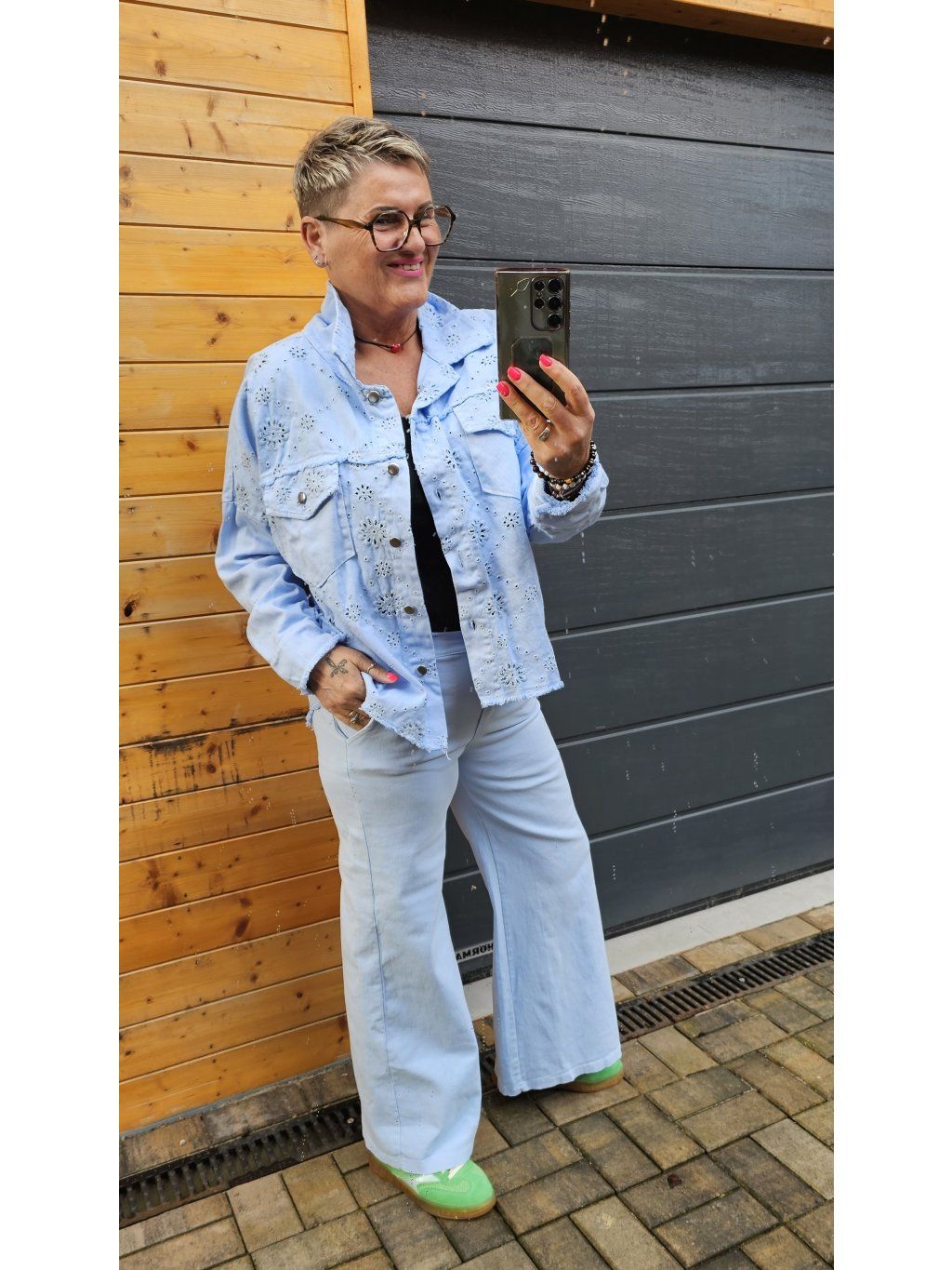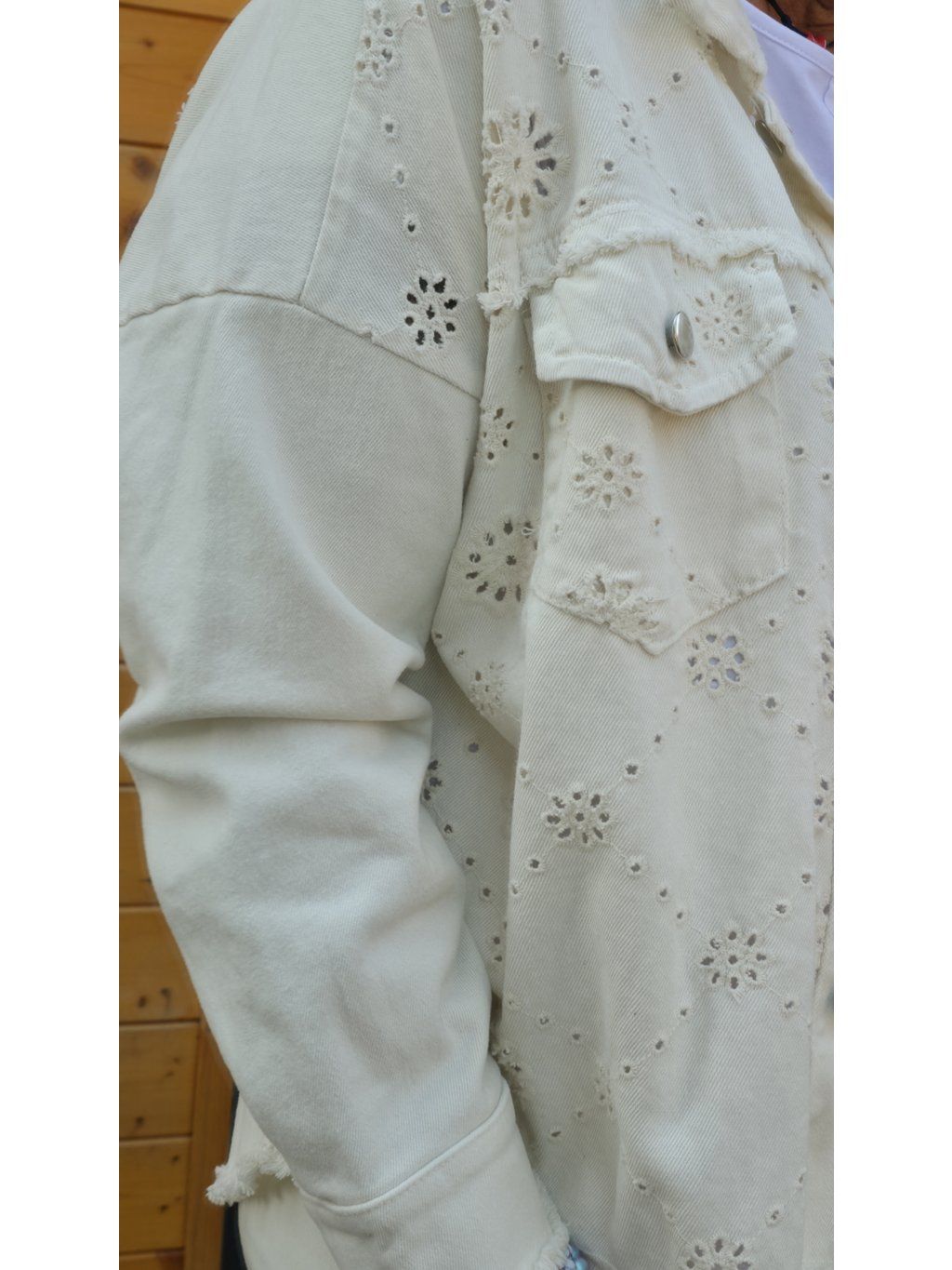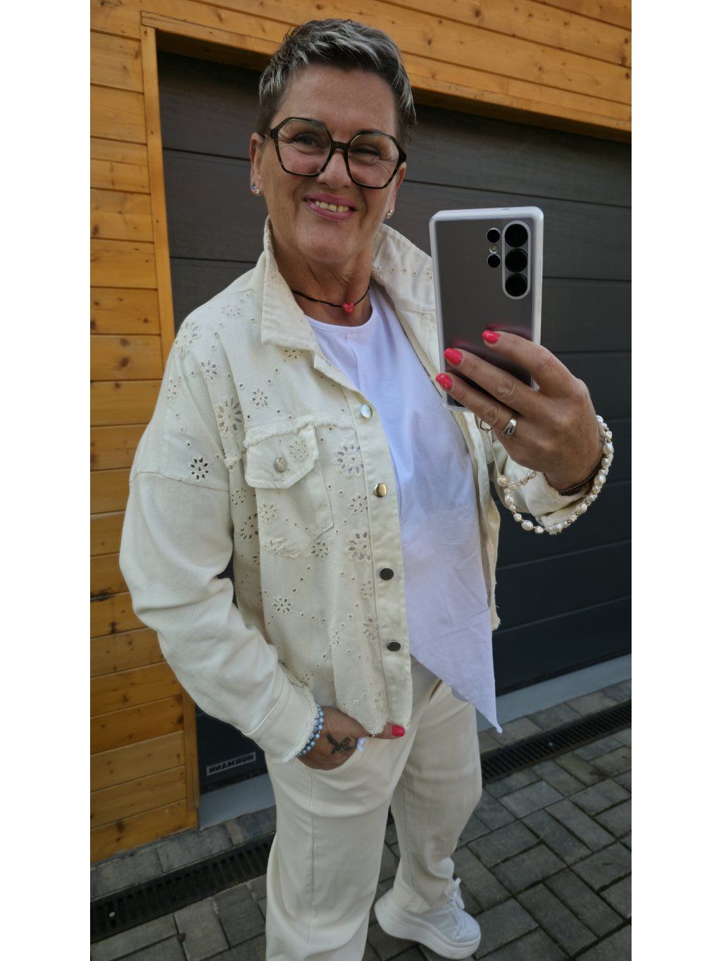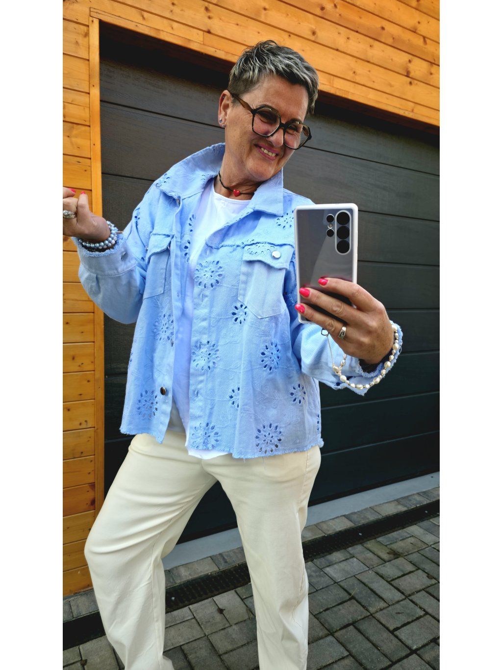 Originální jeans bunda s madeira výšivkou, zapínáním na knoflíky a jemně prodlouženým zadním dílem. Stylový a ženský kousek s pohodlným elastickým materiálem.