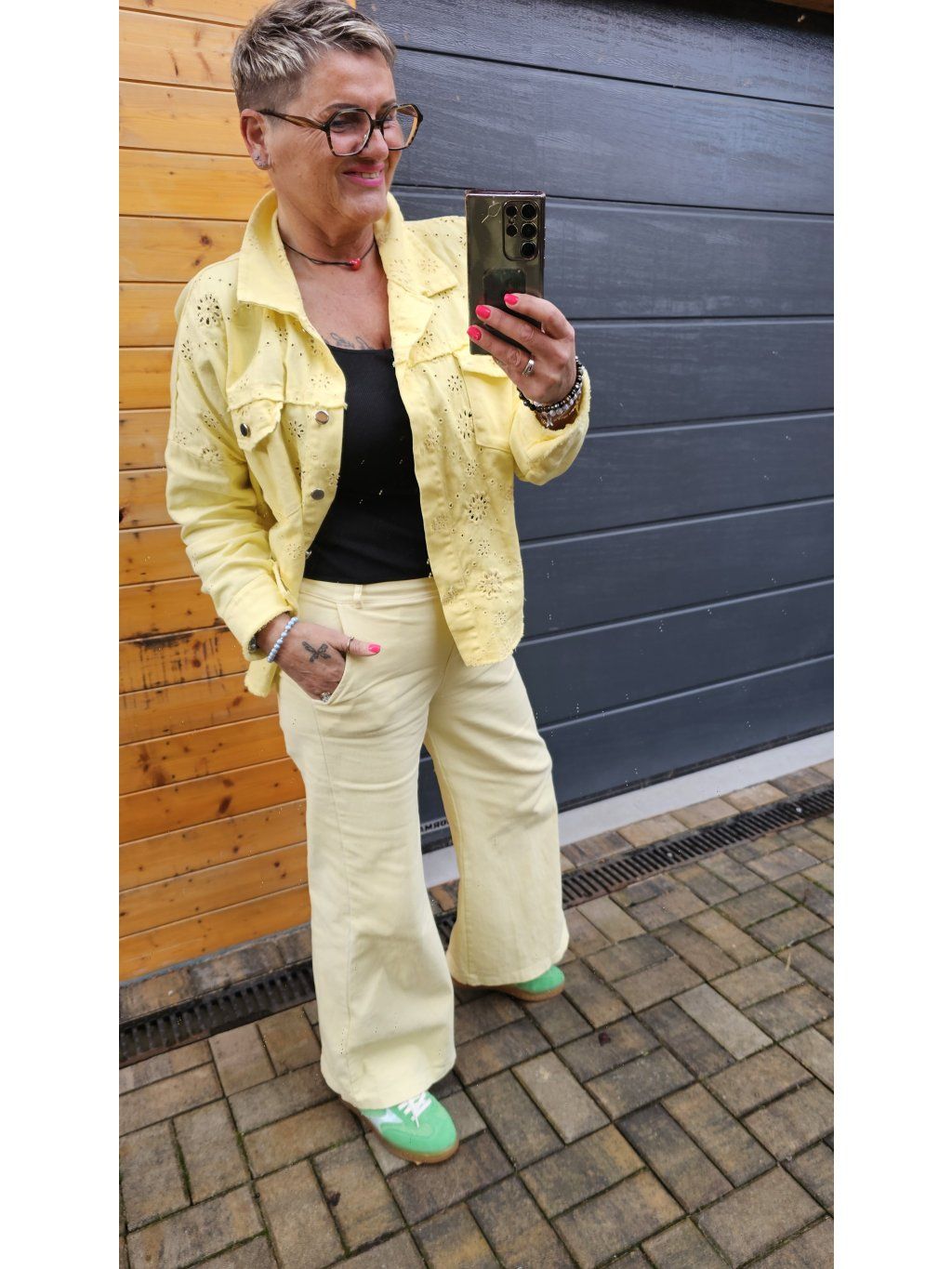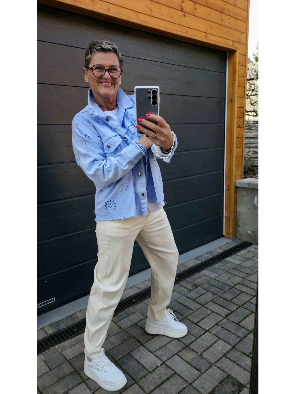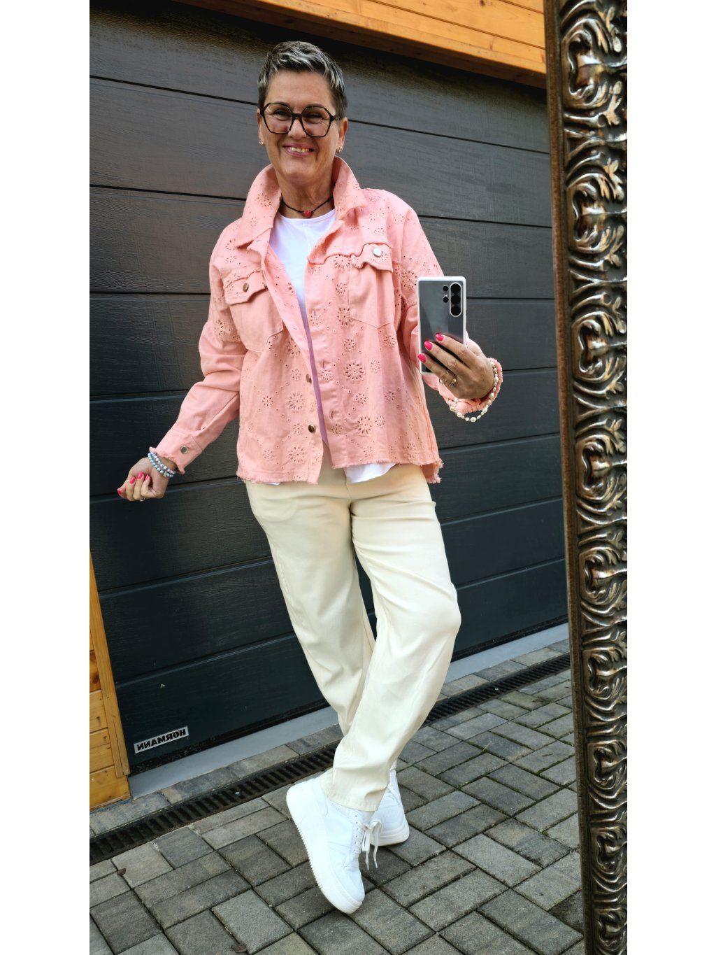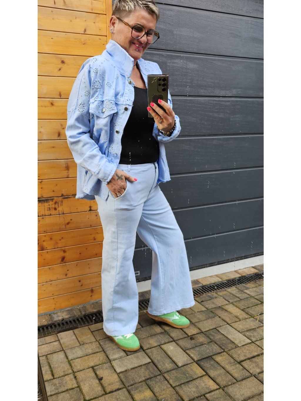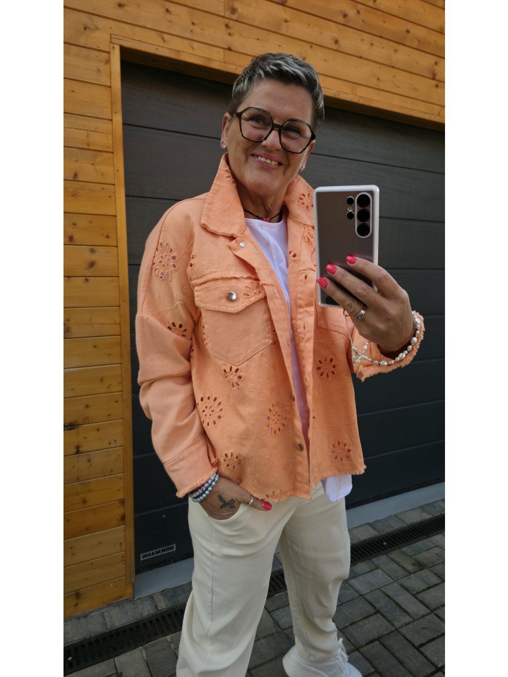 Originální jeans bunda s madeira výšivkou, zapínáním na knoflíky a jemně prodlouženým zadním dílem. Stylový a ženský kousek s pohodlným elastickým materiálem.