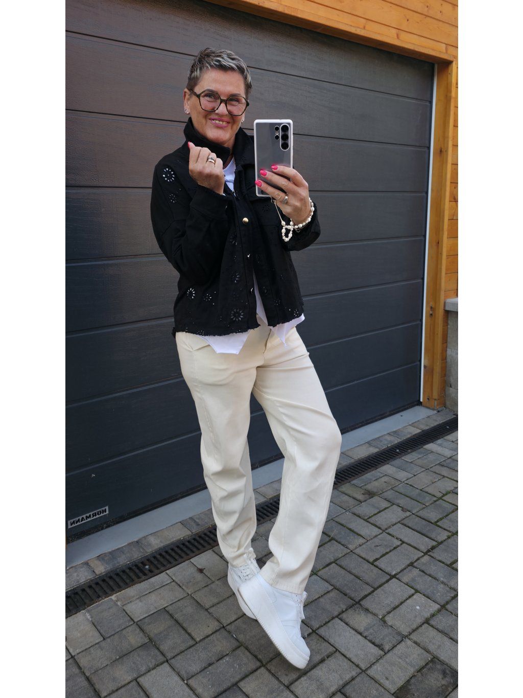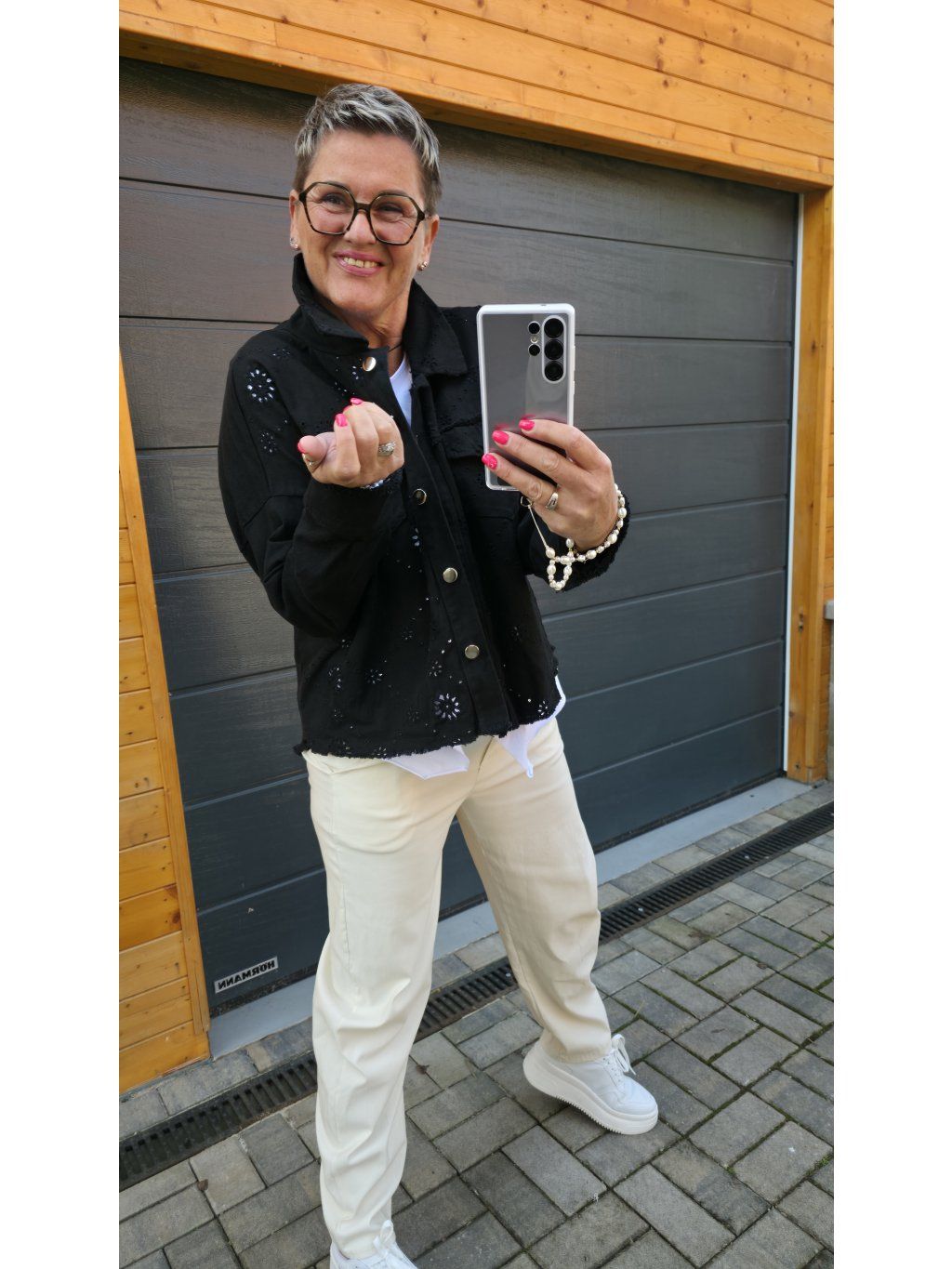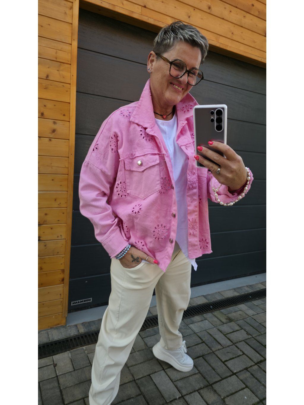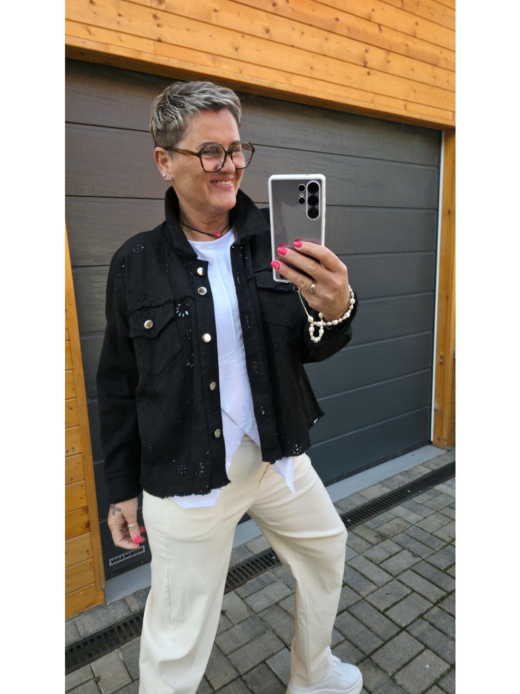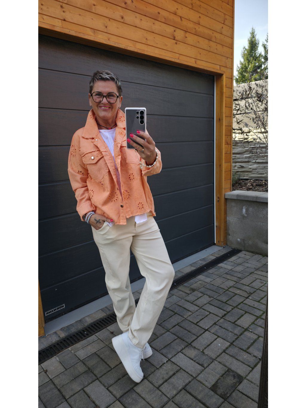 Originální jeans bunda s madeira výšivkou, zapínáním na knoflíky a jemně prodlouženým zadním dílem. Stylový a ženský kousek s pohodlným elastickým materiálem.