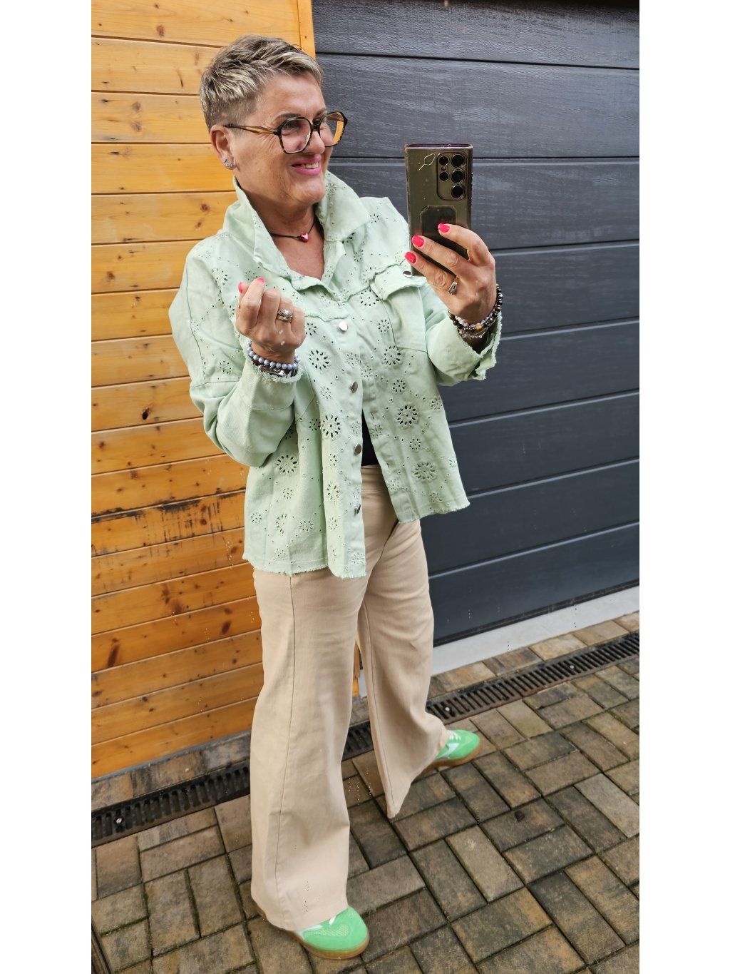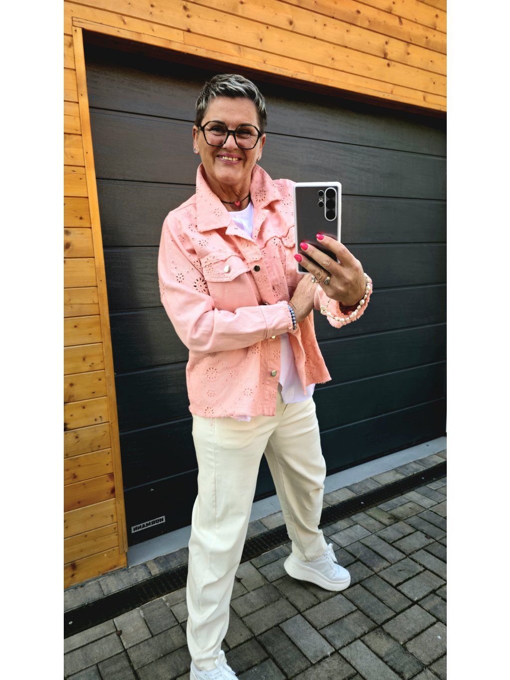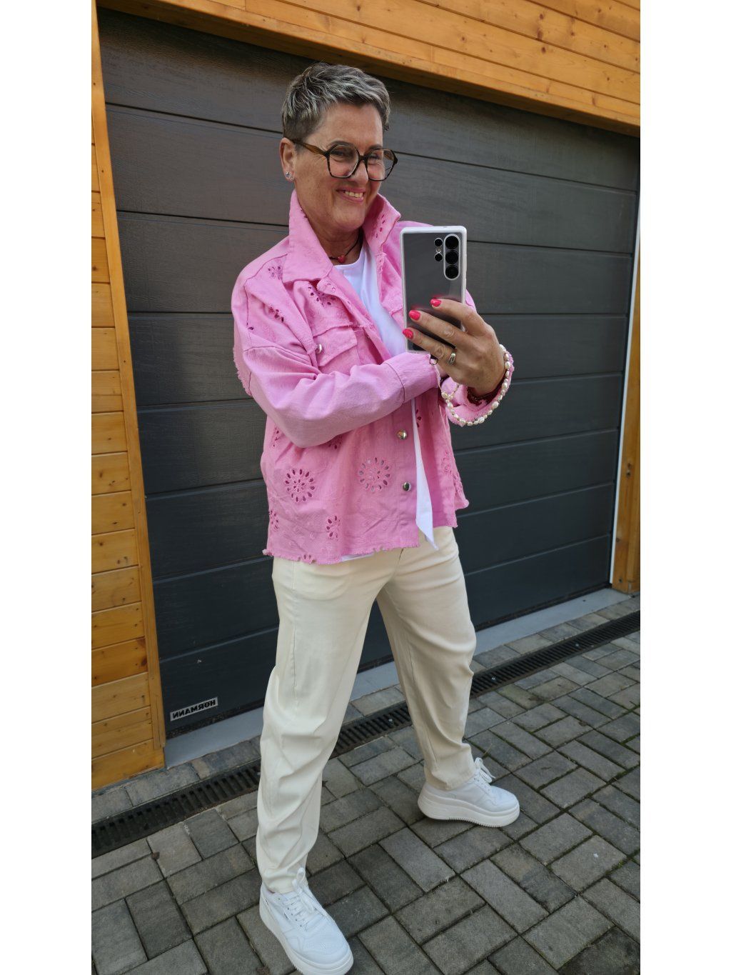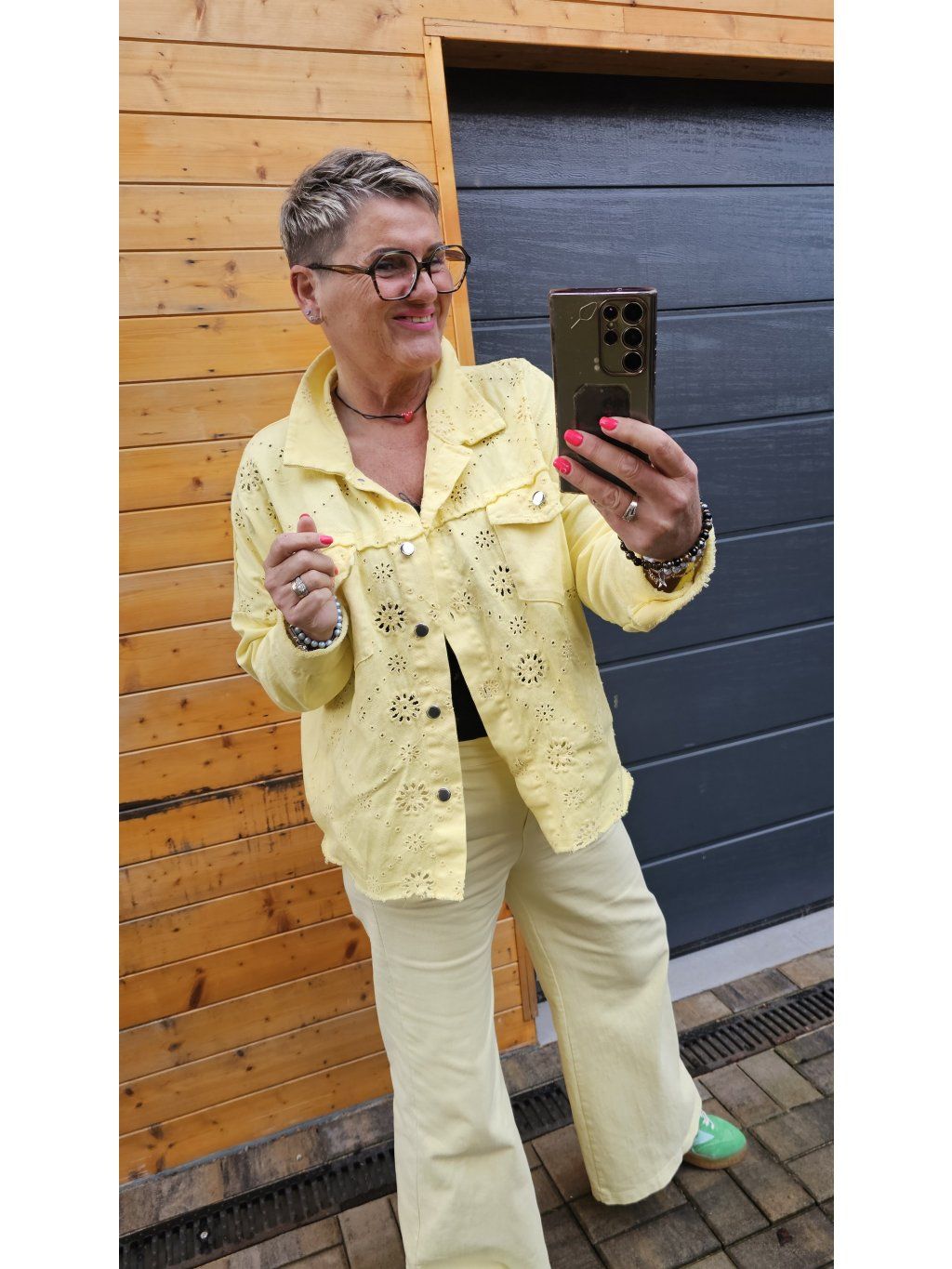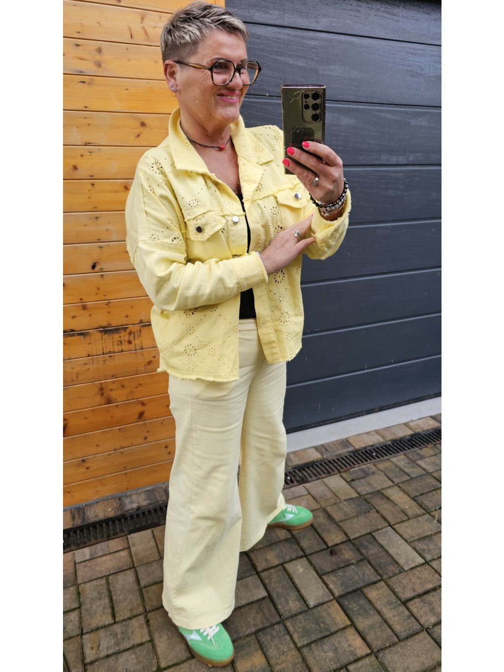 Originální jeans bunda s madeira výšivkou, zapínáním na knoflíky a jemně prodlouženým zadním dílem. Stylový a ženský kousek s pohodlným elastickým materiálem.