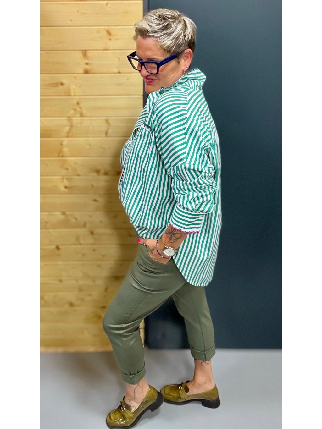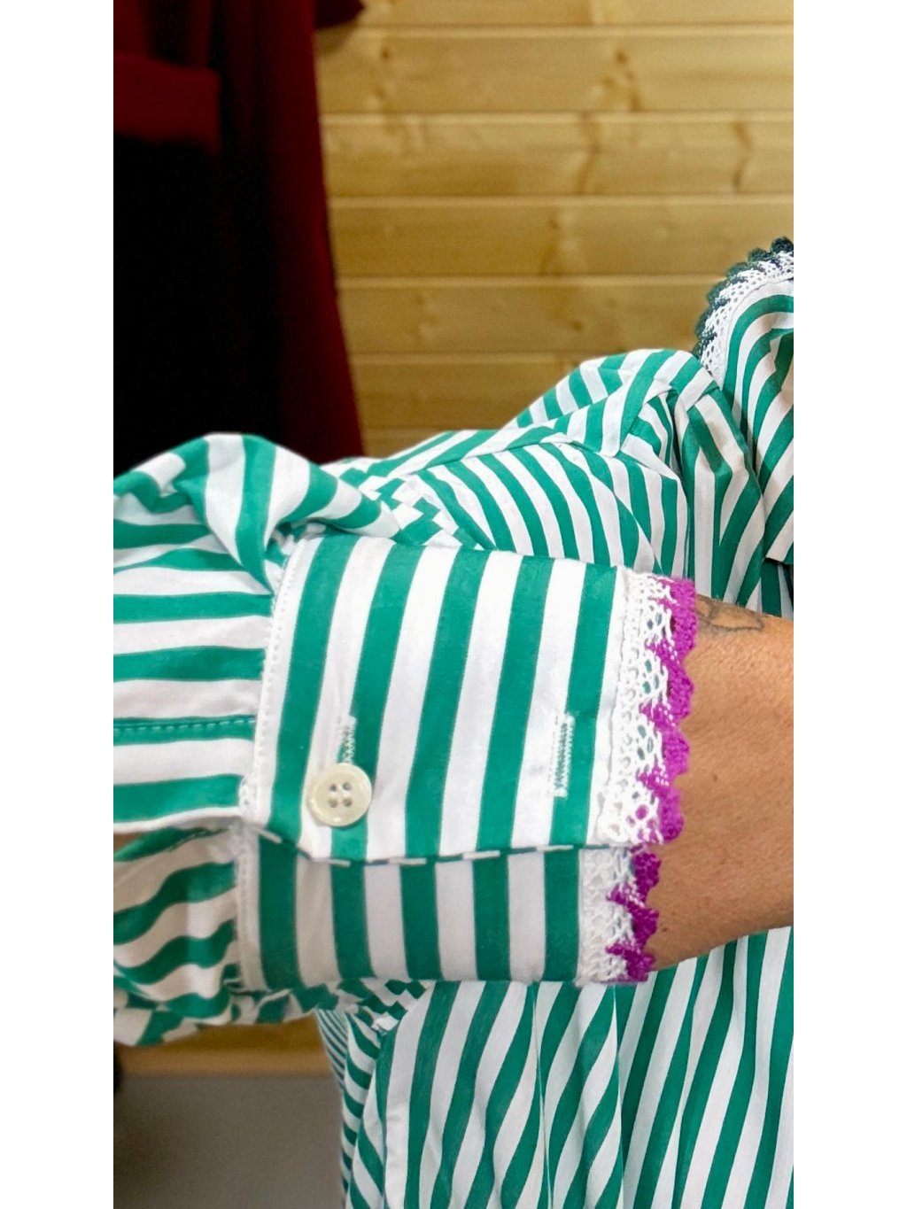 Košile má volnější střih, který krásně padne různým typům postav. Pruhy dodávají svěží a moderní vzhled, zatímco jemná krajka na rukávech a kapse přináší nečekaný romantický detail ✨. Skvěle se kombinuje jak s elegantními kalhotami, tak s džínami nebo pod svetřík či sako — prostě univerzální kousek, který oživí šatník..