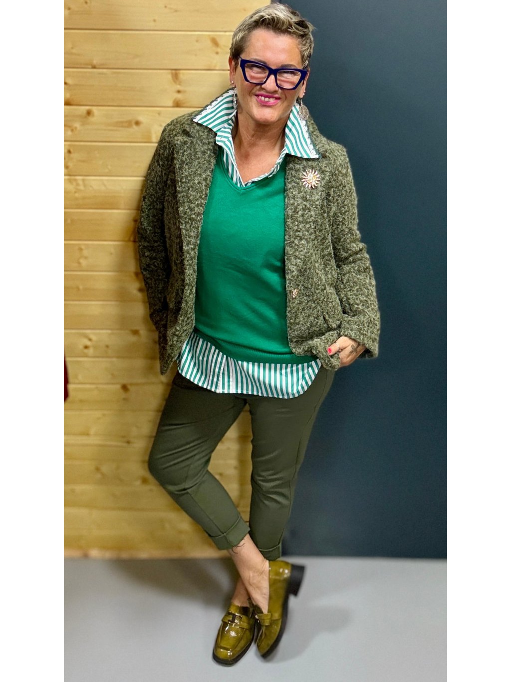 Zkombinuj ji se zelenými nebo bílými kalhotami pro svěží look, případně s džínami a mokasínami pro pohodlnou eleganci. Skvěle ladí také pod vestičky či pletené svetříky.