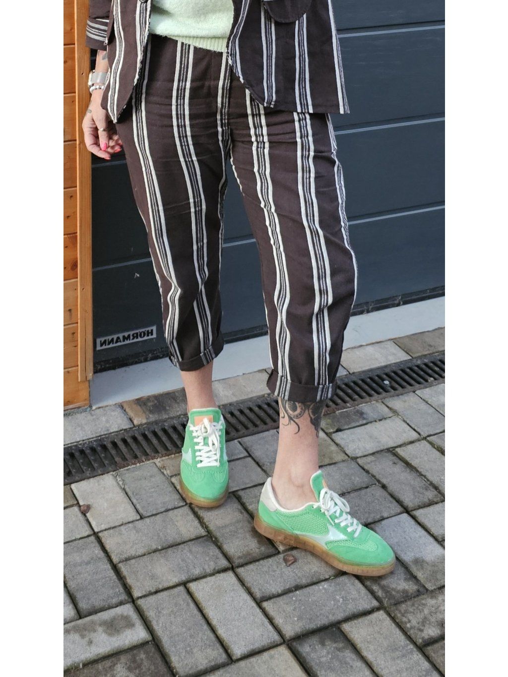 Pruhované kalhoty s ohrnutou nohavicí – pohodlná elegance