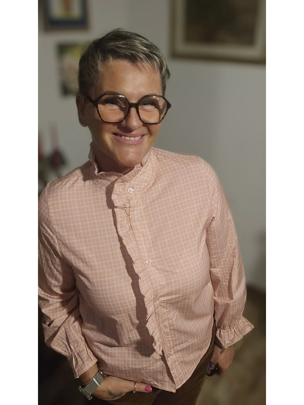 Lehoučká bavlněná košile s jemnou kostičkou, stojáčkem a volánkem podél zapínání. Elegantní, ženská a přitom pohodlná – ideální k džínům i ke kalhotám do práce.