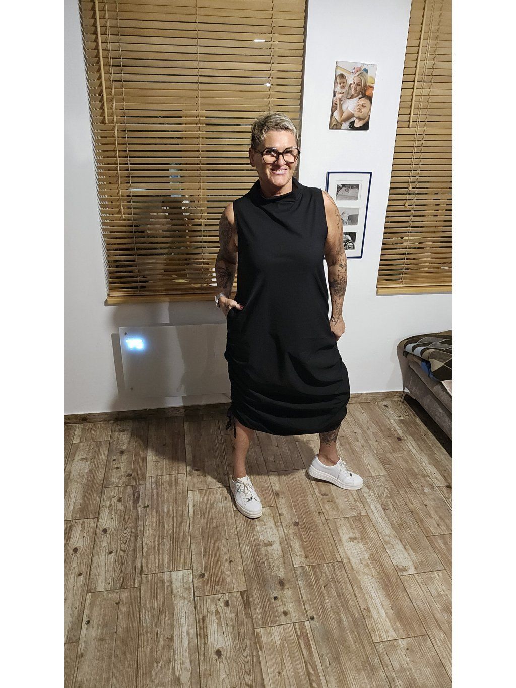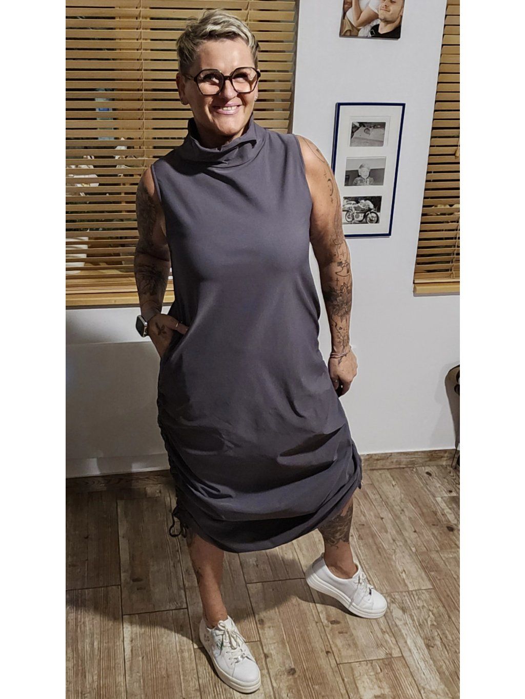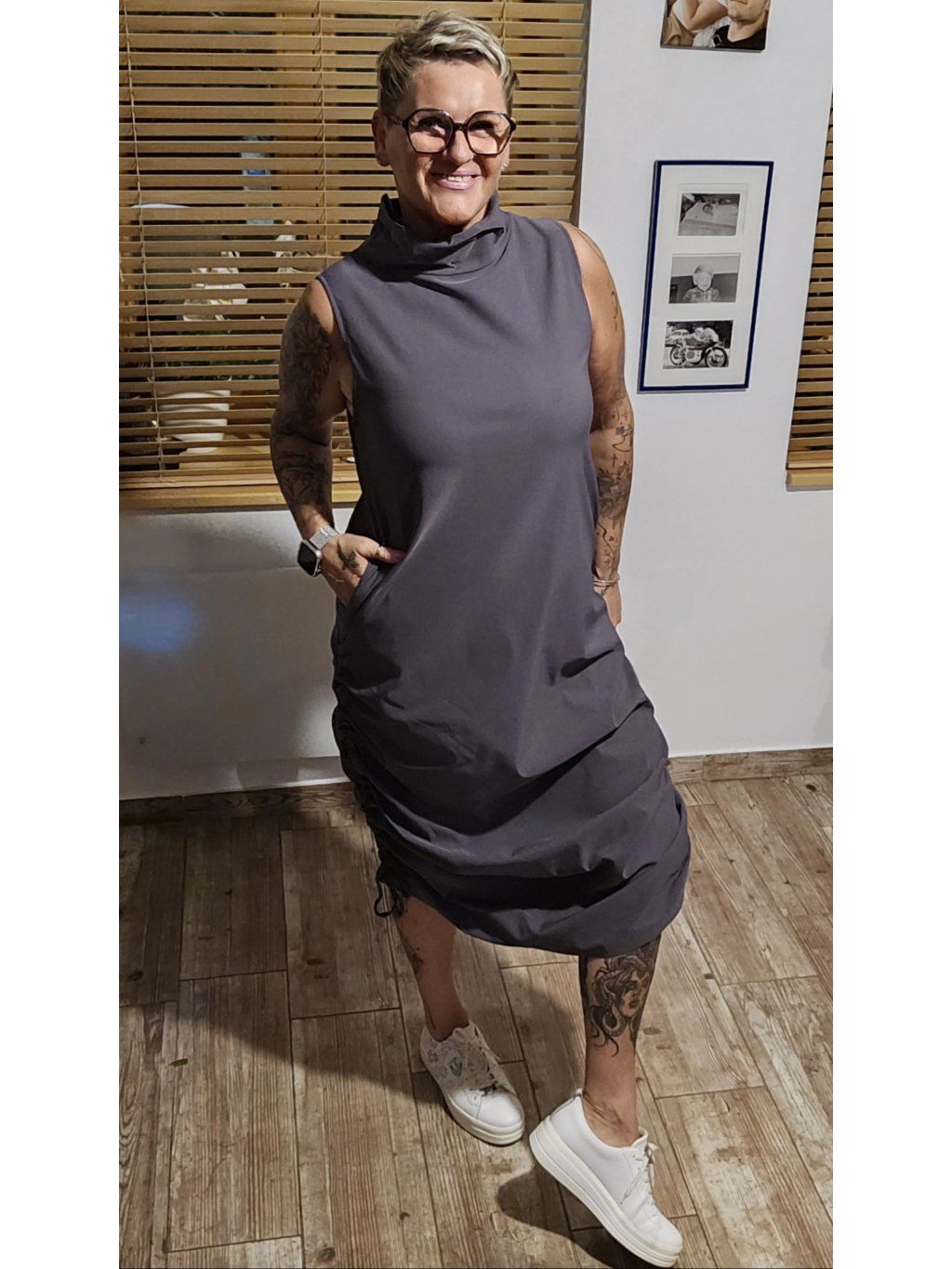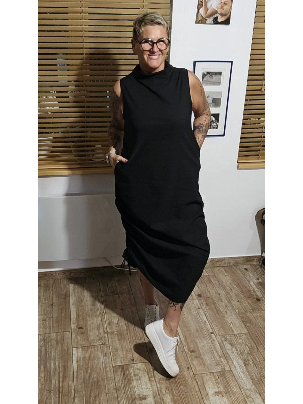 Maximálně pohodlné, a přitom stylové šaty bez rukávů se stojáčkem, kapsami a bočním řasením, díky kterému si upravíš délku i tvar podle nálady. Ideální na léto, cestování i město.