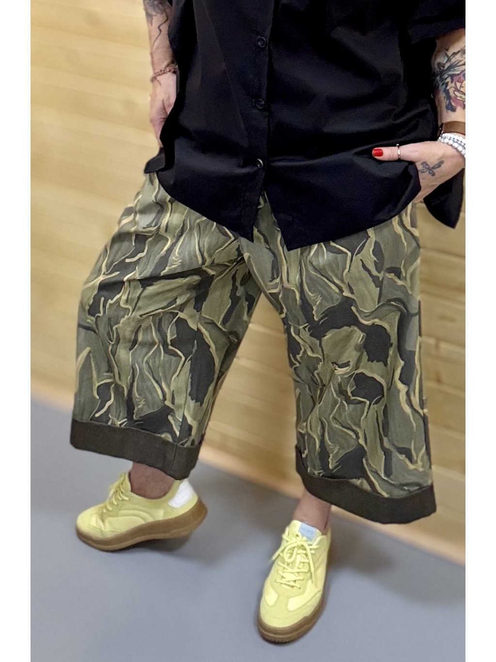 Když pohodlí a styl jdou ruku v ruce. Tyto široké 3/4 kalhoty v krásné zelené barvě přitahují pozornost díky svému originálnímu a výraznému vzoru. V kombinaci s bavlnou a elastanem ti kalhoty nabídnou nejen skvělý vzhled, ale také maximální komfort.