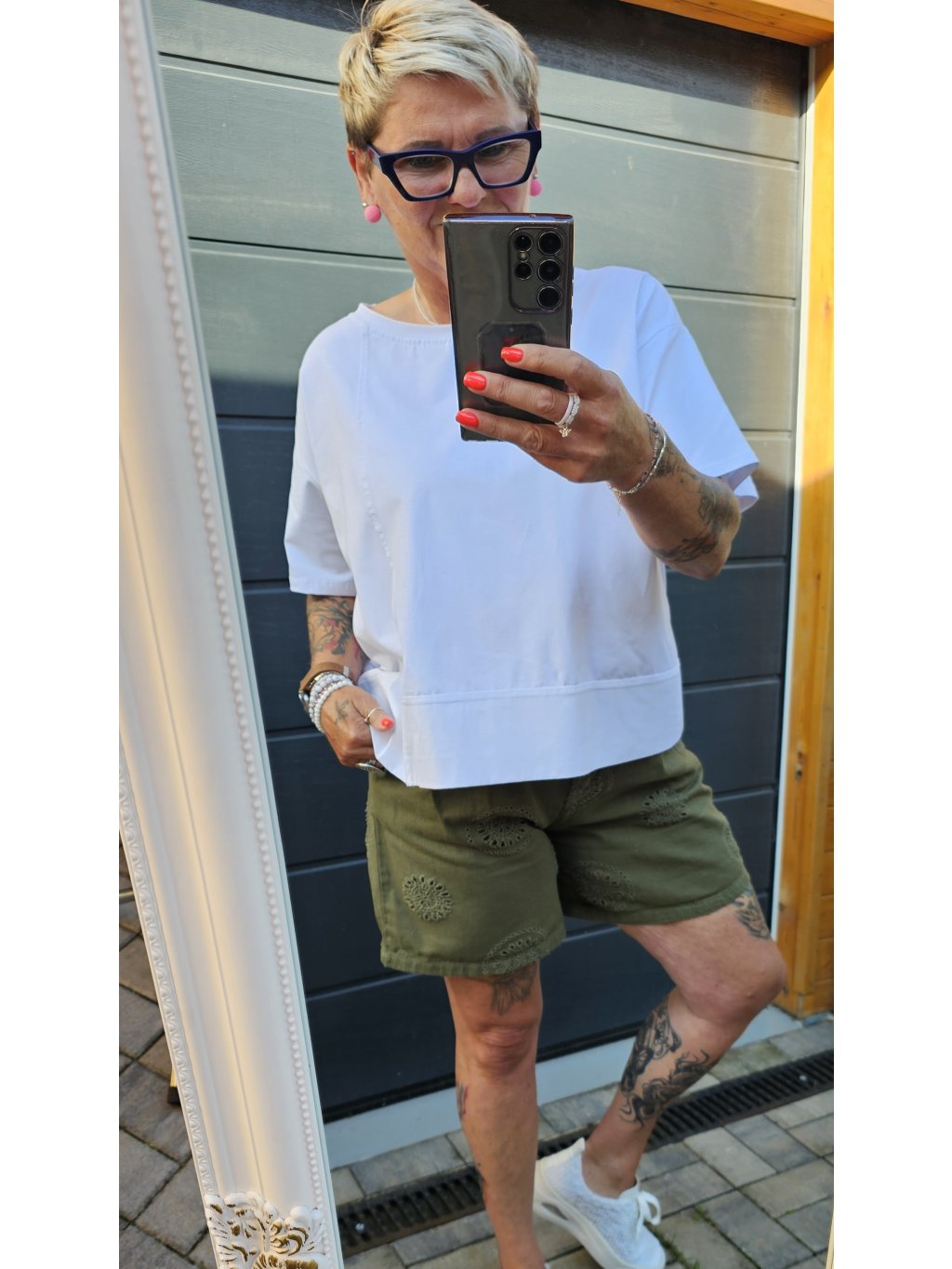 Originální kraťasy z pevnější látky s výšivkami, které připomínají mandaly. Skvělý volnočasový kousek s pohodlným střihem a stylovým detailem.