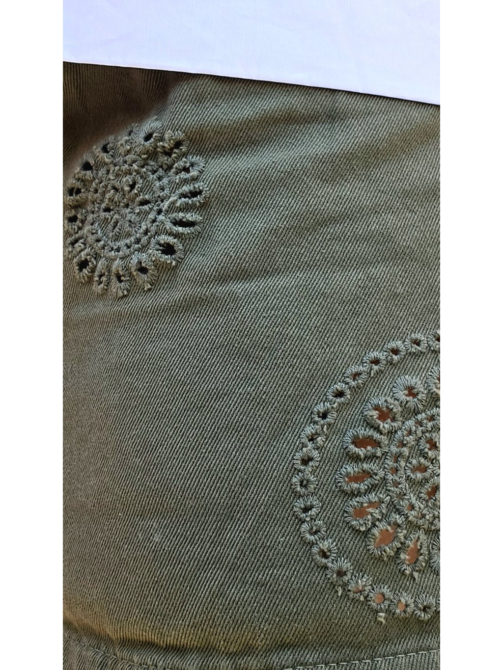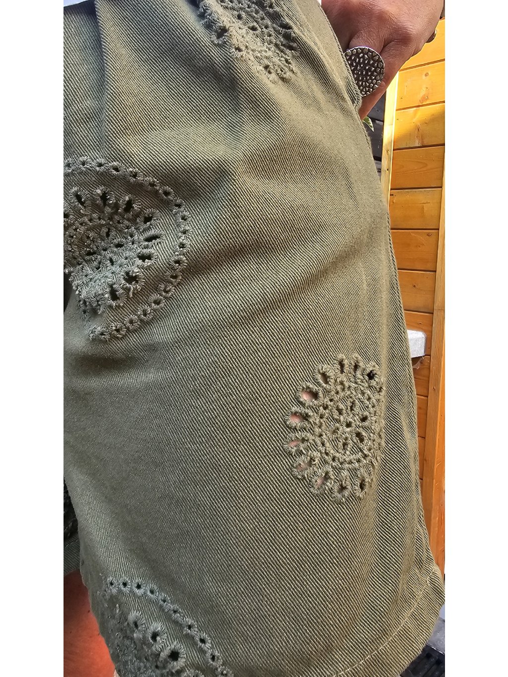 Tyto šortky z pevnější bavlněné látky v khaki a béžovém odstínu zdobí jemné, ale nápadité výšivky v mandalovém stylu. Každý výšivkový motiv je originální a dodává šortkám jedinečný boho šmrnc.