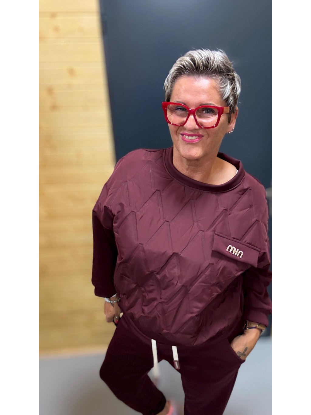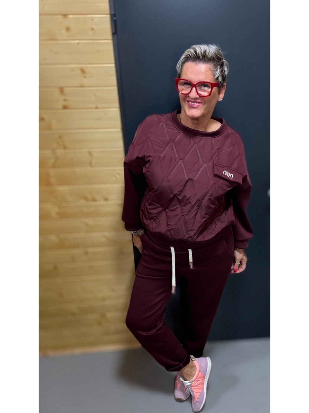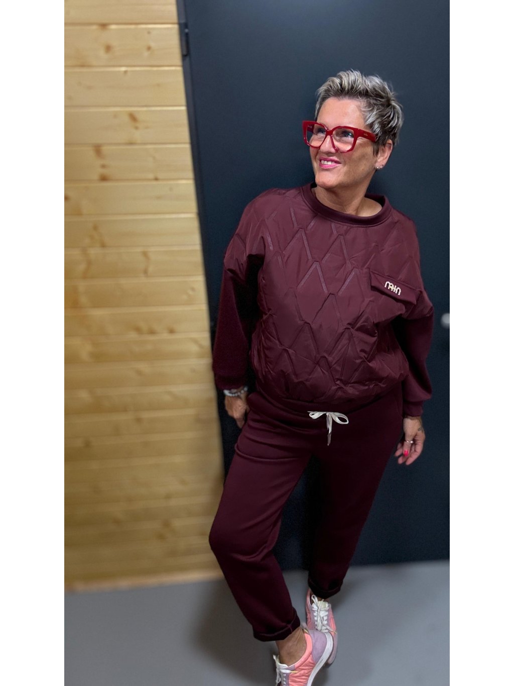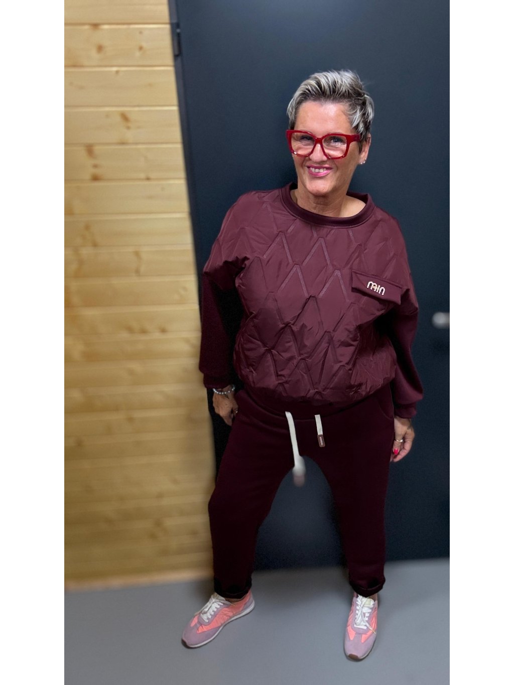 Díky volnějšímu střihu mikiny a pružnému pasu kalhot je vhodná pro typy O / H / X — krásně skryje bříško, lichotí ramenům a zvýrazní nohy.