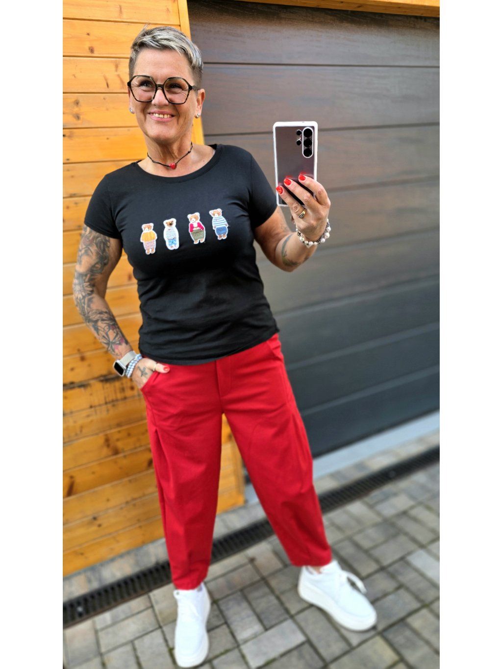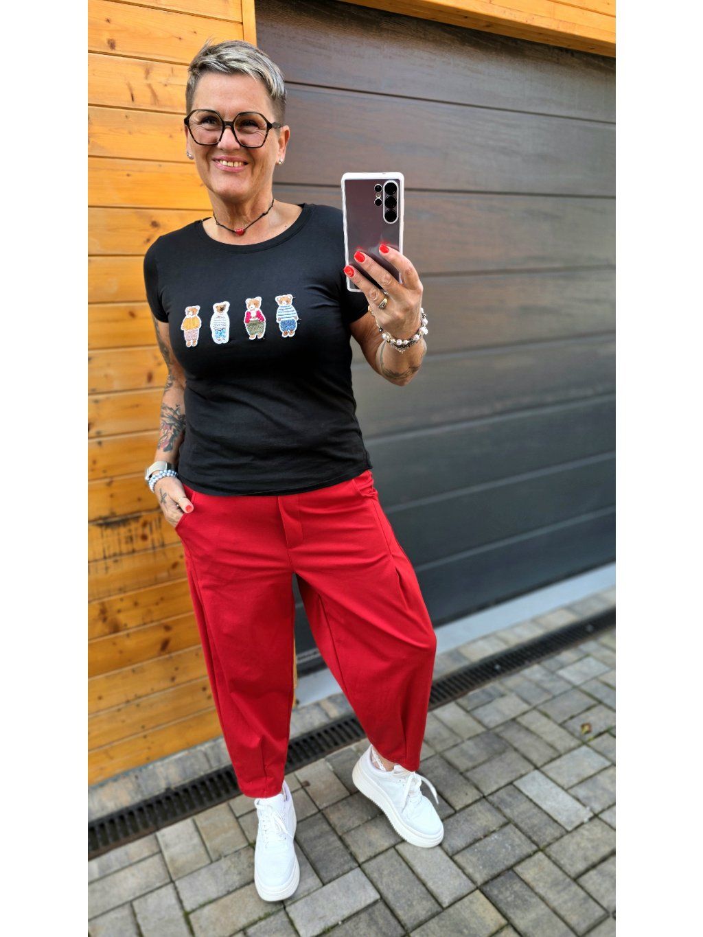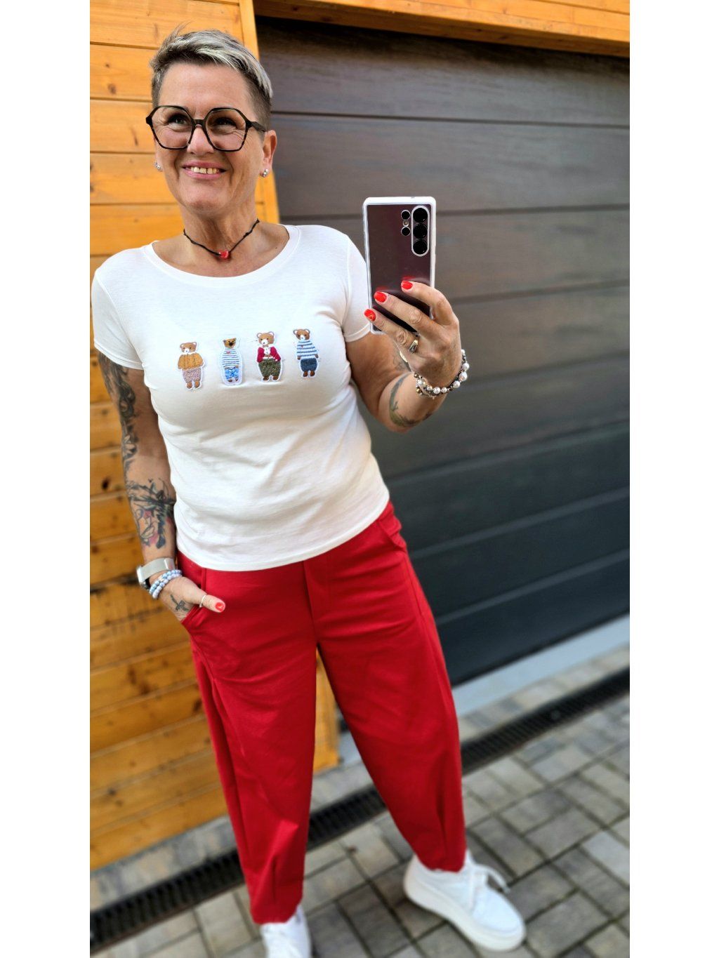 Skvěle vynikne i s barevnými kalhotami (třeba červené – wow efekt 🔥)