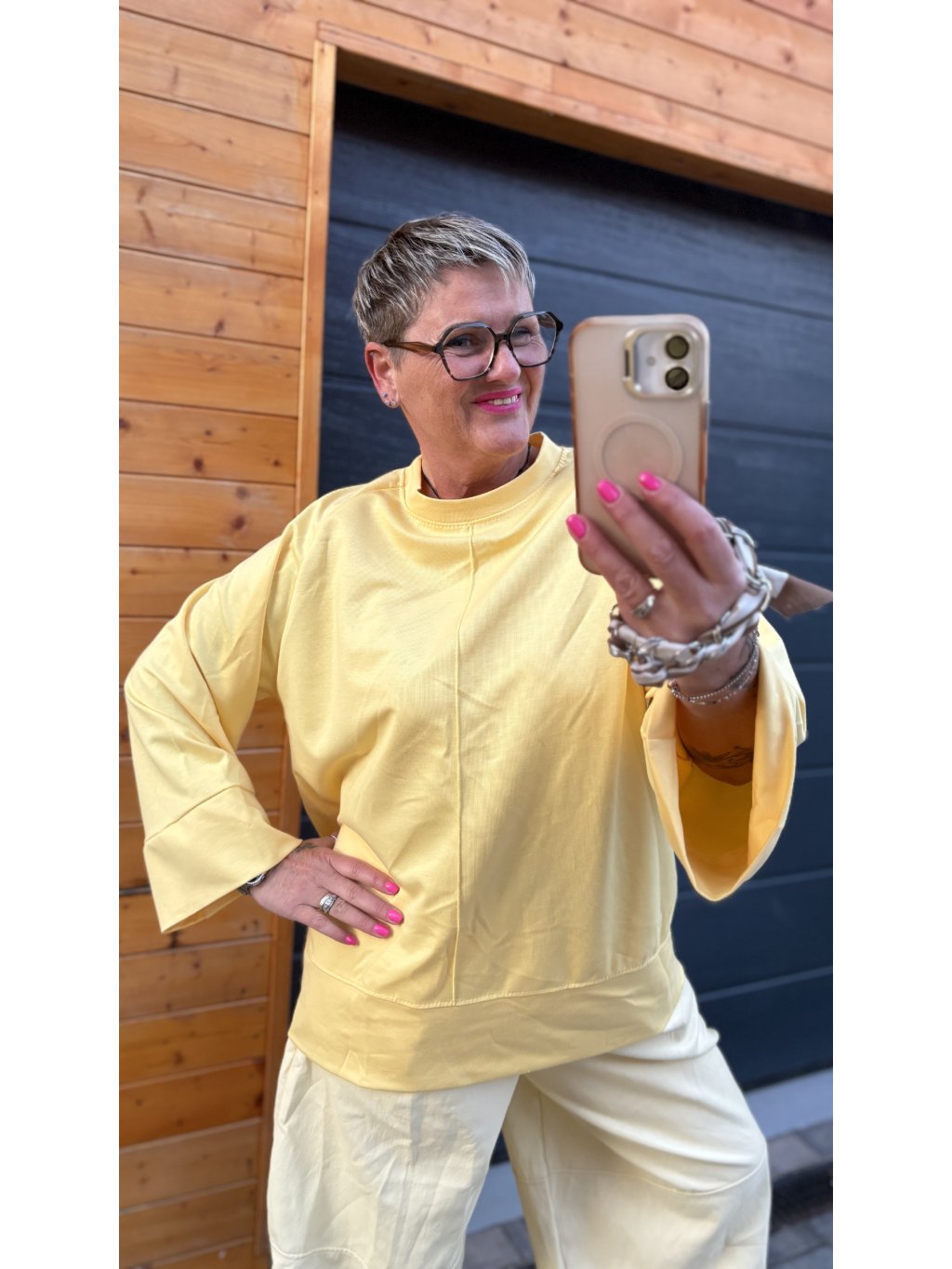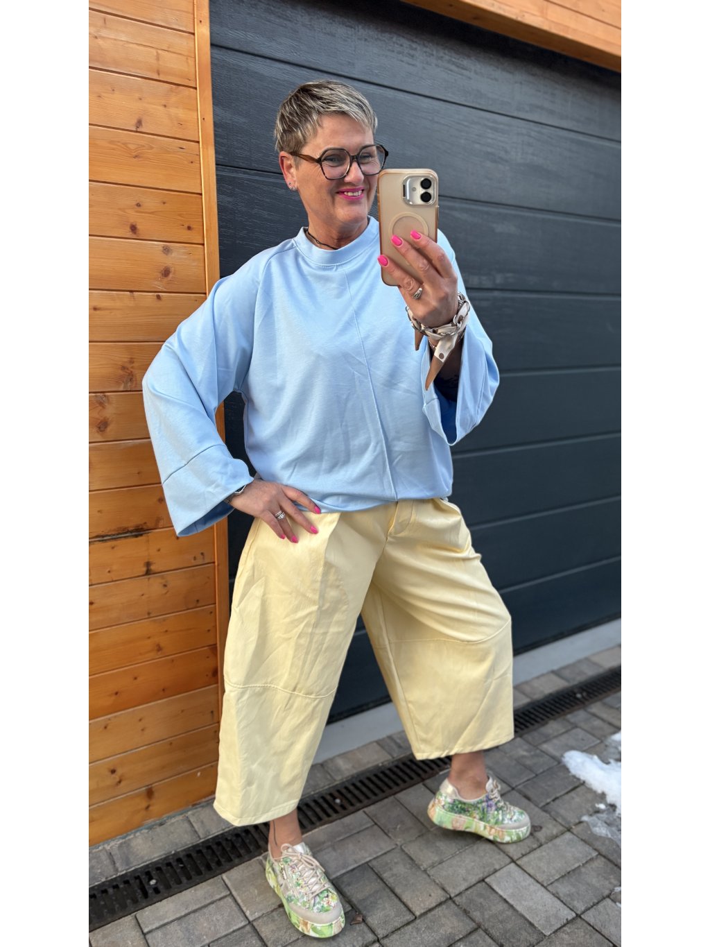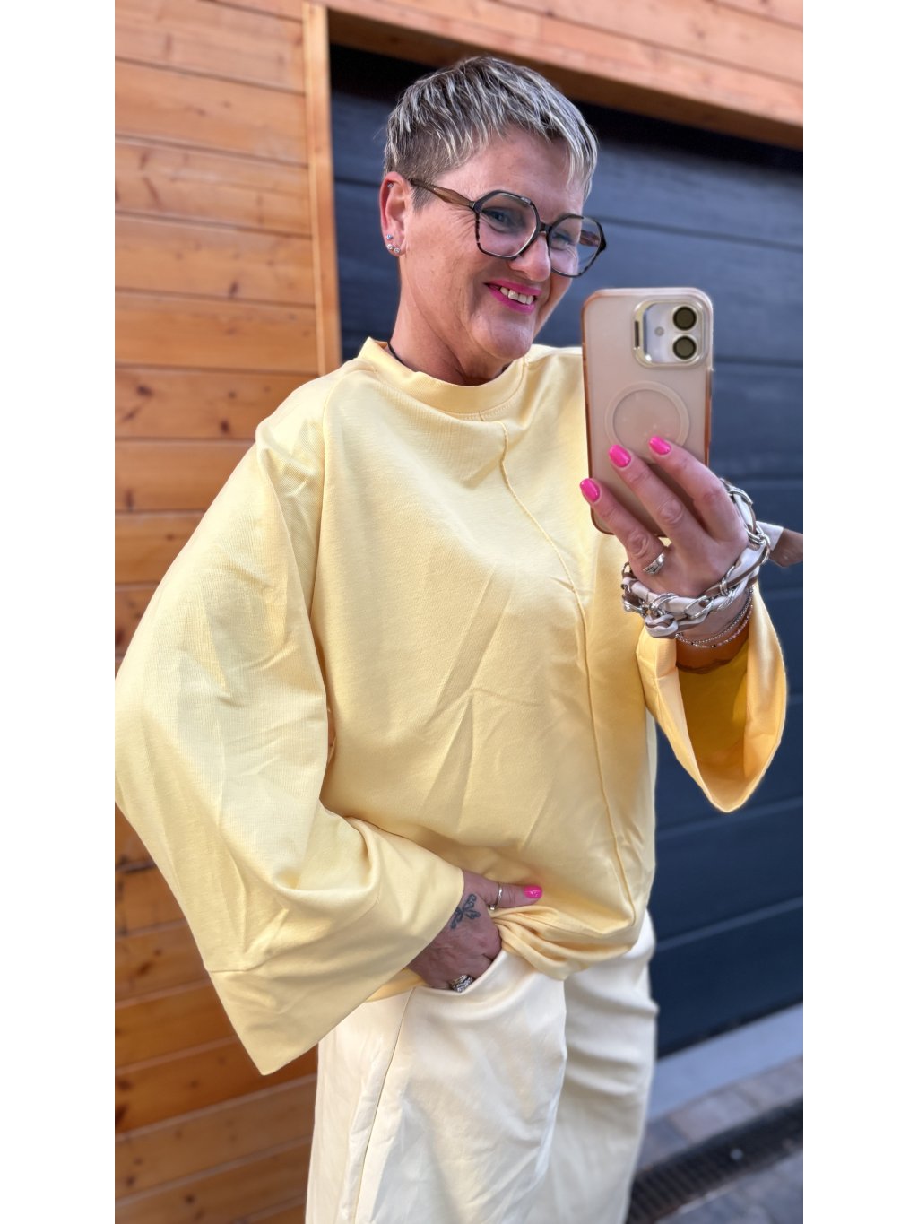 Lehký, pohodový top s moderním střihem a širokými rukávy, který krásně splývá a dává volnost pohybu. Ideální k širokým kalhotám, sukním i výrazným outfitům – prostě kousek, který si zamiluješ na první obléknutí.