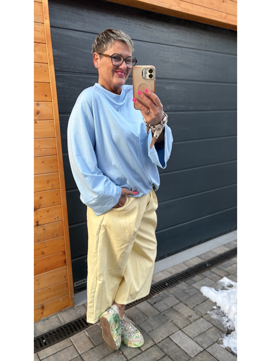 Nádherně vynikne se širokými kalhotami, culottes nebo výraznými kalhotami z umělé kůže. Klidně přidej výrazné boty – tenhle top to unese.