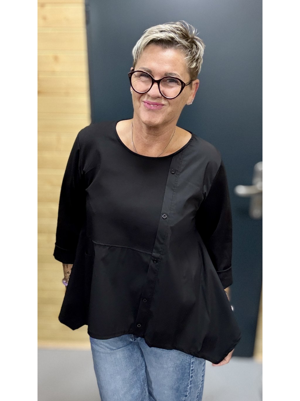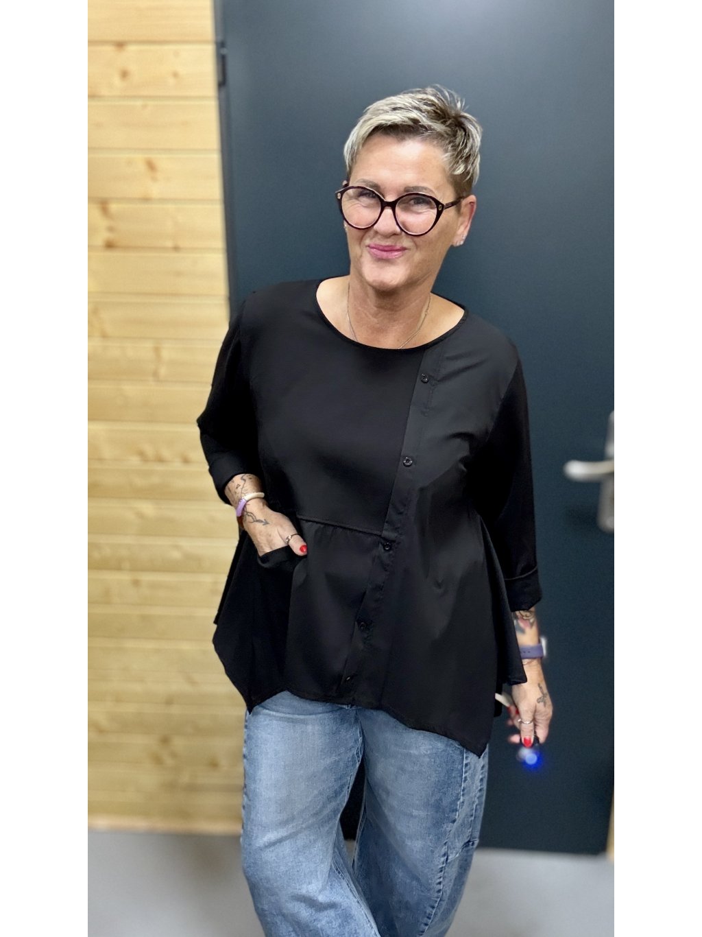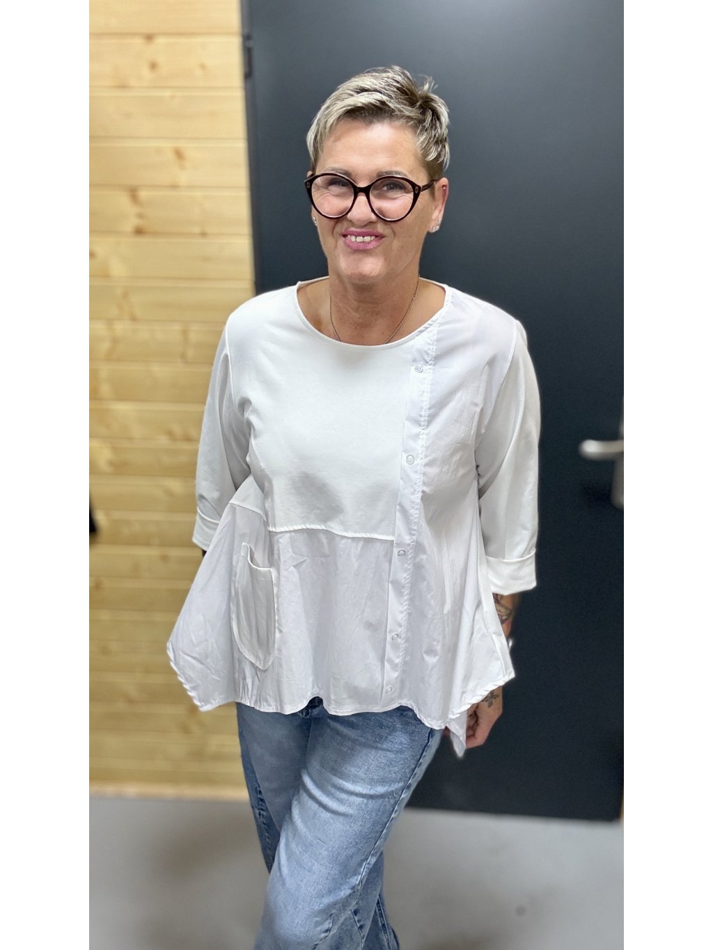 Lehká, pohodlná a ženská halenka s jemnou asymetrií, knoflíčky a kapsičkou. Skvěle sedí, nikde netlačí a dodá outfitu šmrnc bez námahy.