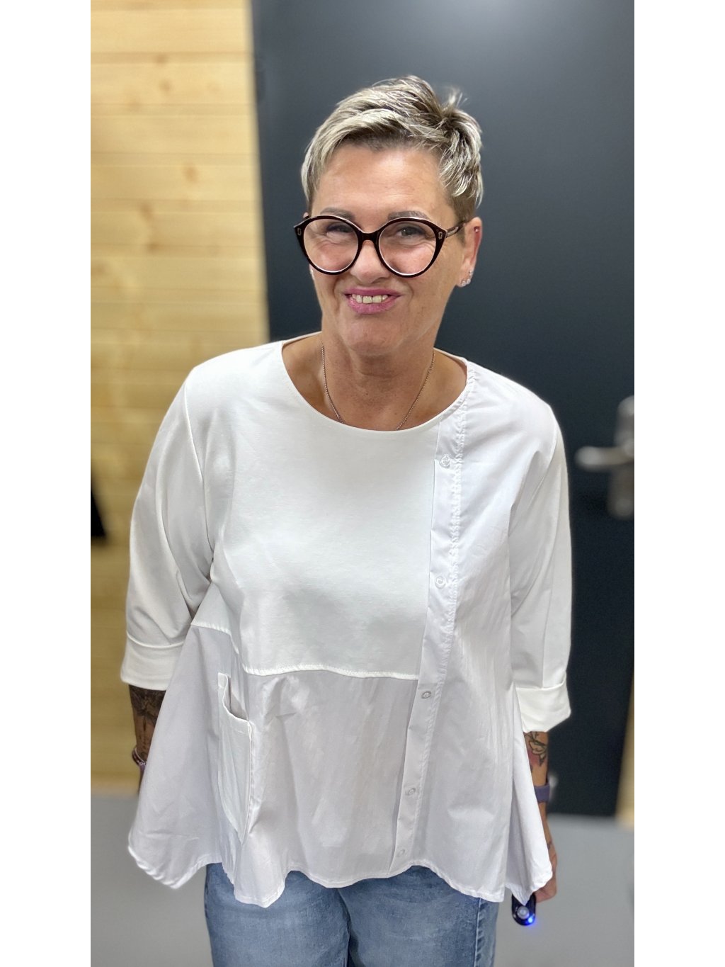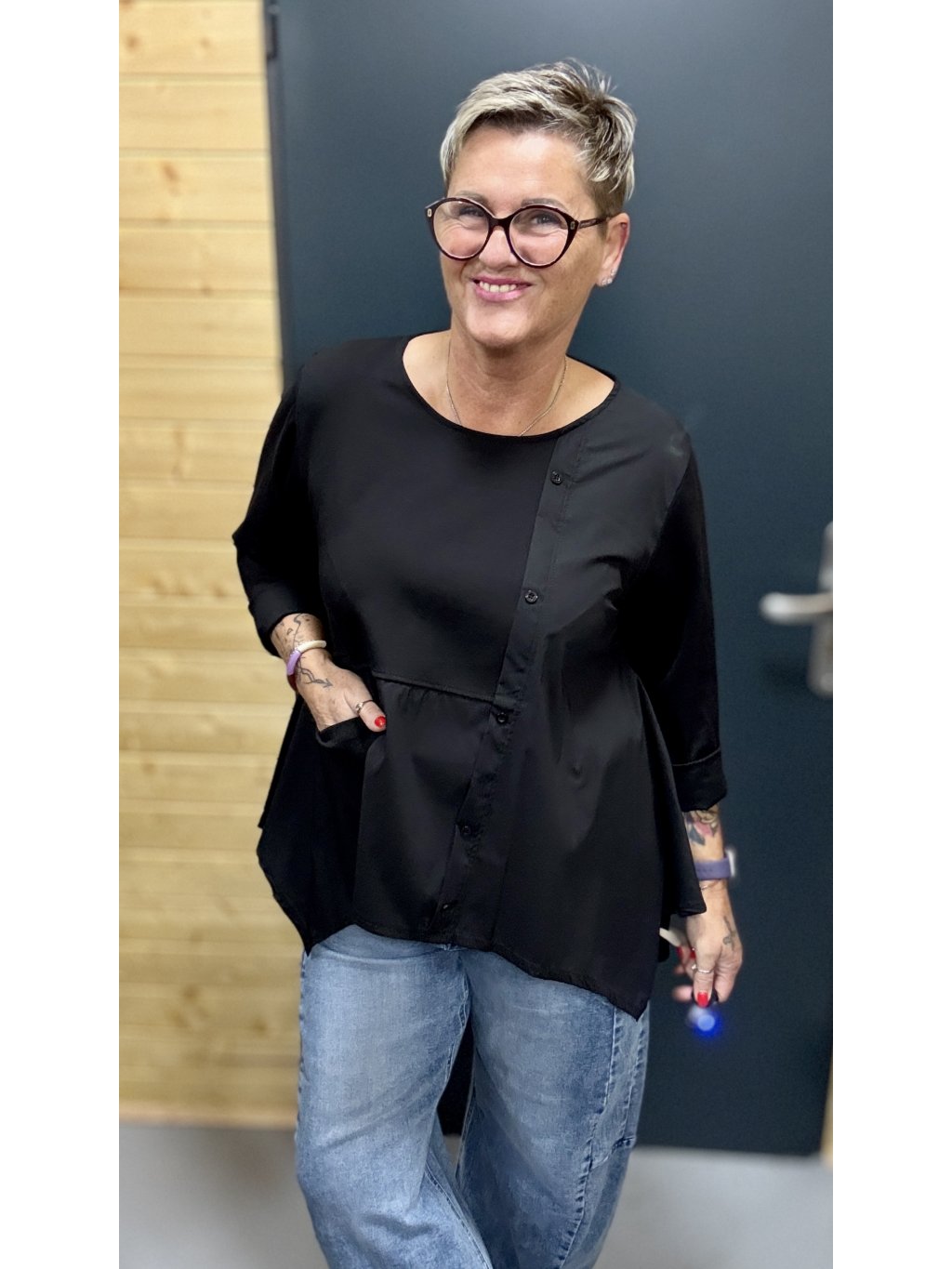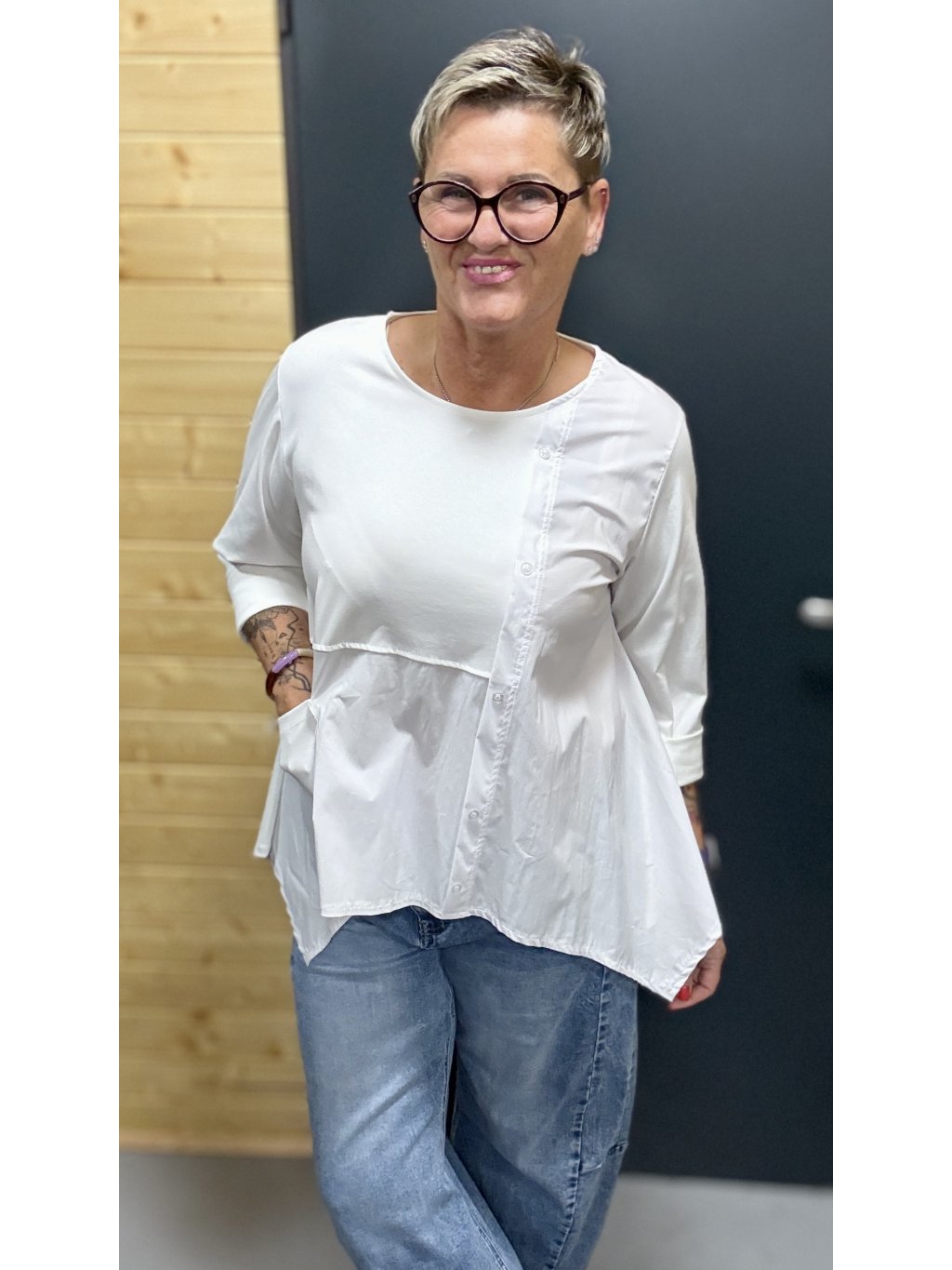 Lehká, pohodlná a ženská halenka s jemnou asymetrií, knoflíčky a kapsičkou. Skvěle sedí, nikde netlačí a dodá outfitu šmrnc bez námahy.