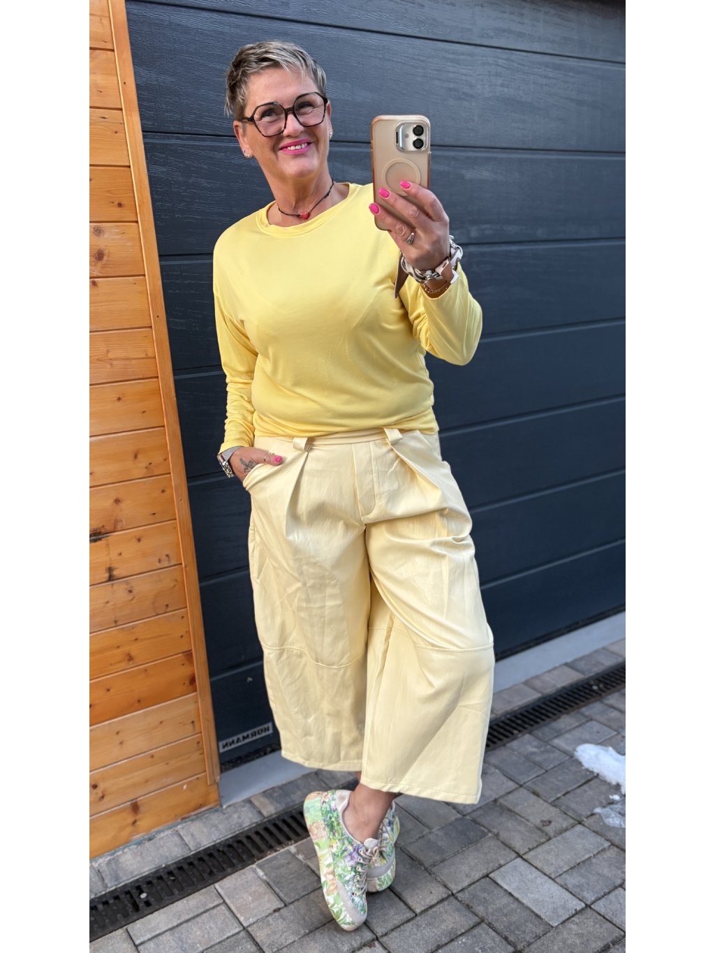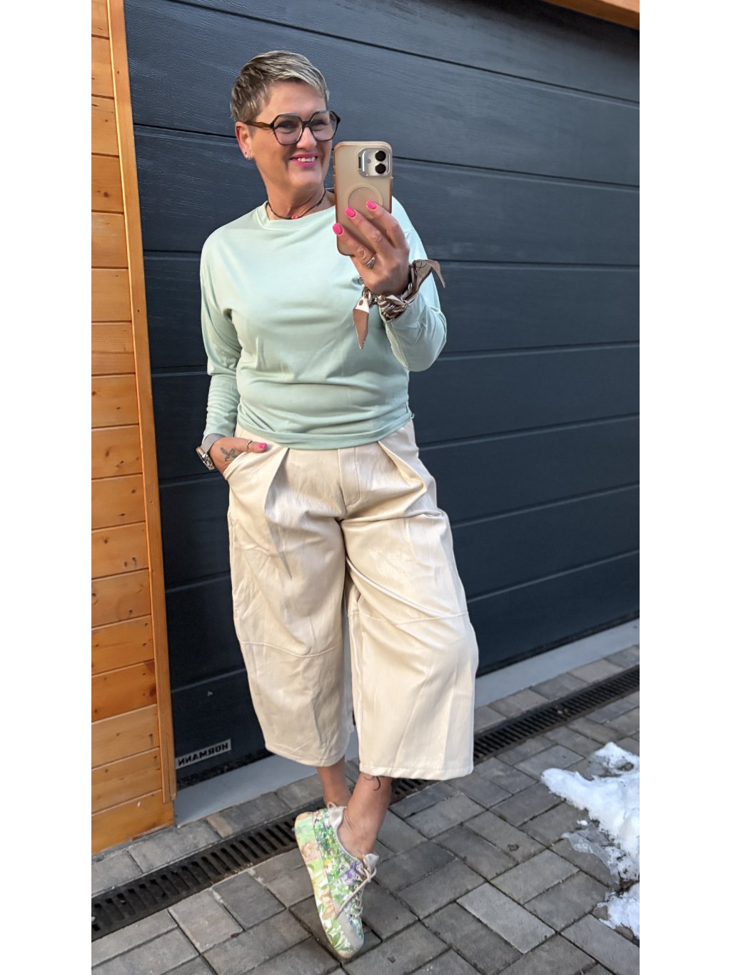 širokými kalhotami