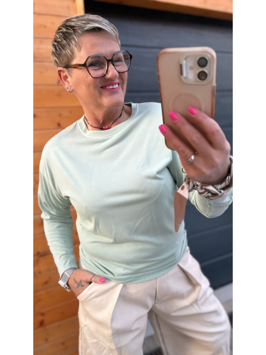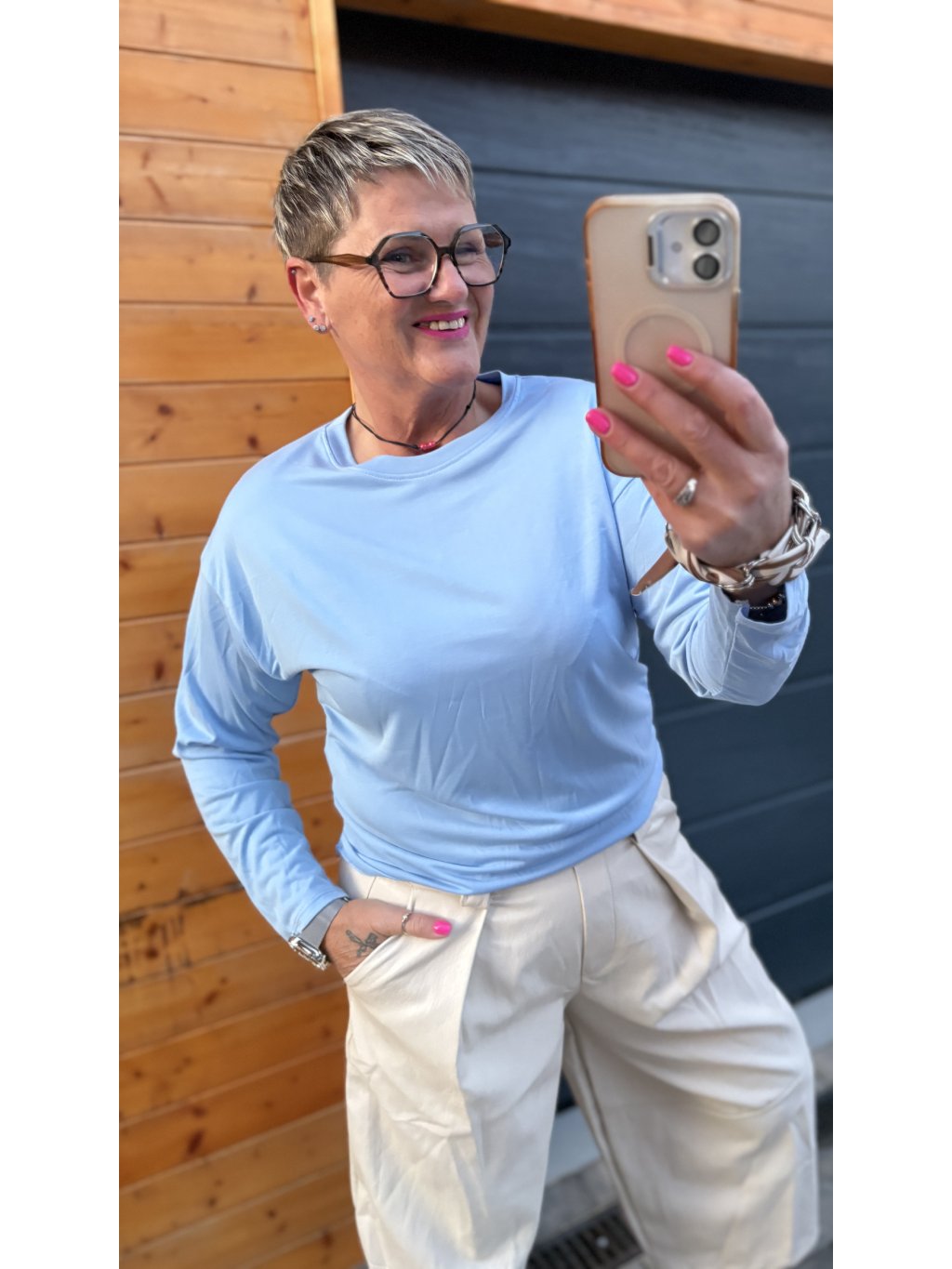 Lehký, příjemný materiál z viskózy a polyesteru krásně splývá, je hebký na dotek a přizpůsobí se postavě. Díky pružnosti se pohodlně nosí celý den – nikde netáhne, neškrtí a drží tvar.